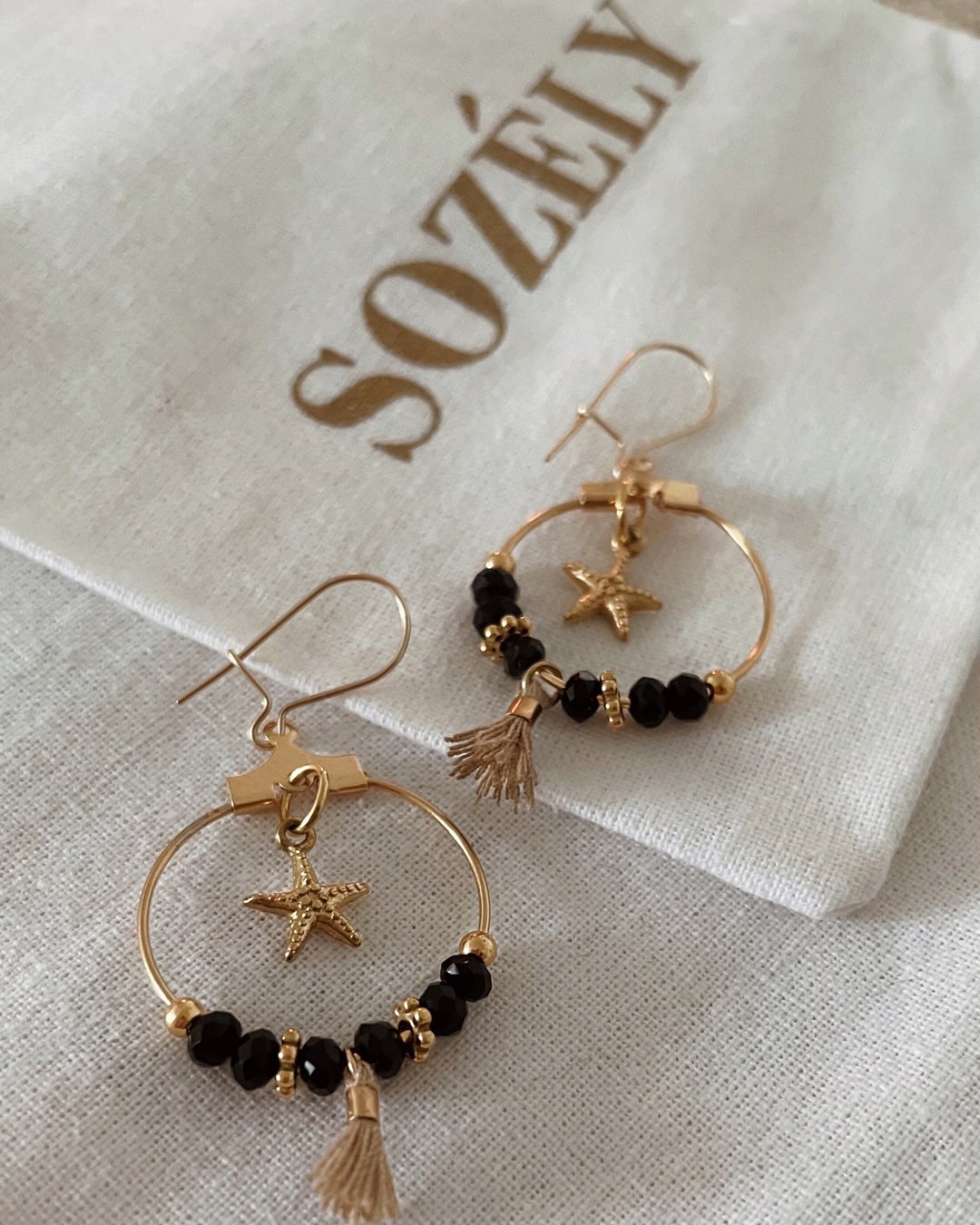 -Boucles d’oreilles créoles en acier inoxydable doré ornées de perles facettées noires, mini pompons beige et breloques en acier inoxydable doré. La touche d’élégance qui sublimera votre look du jour.