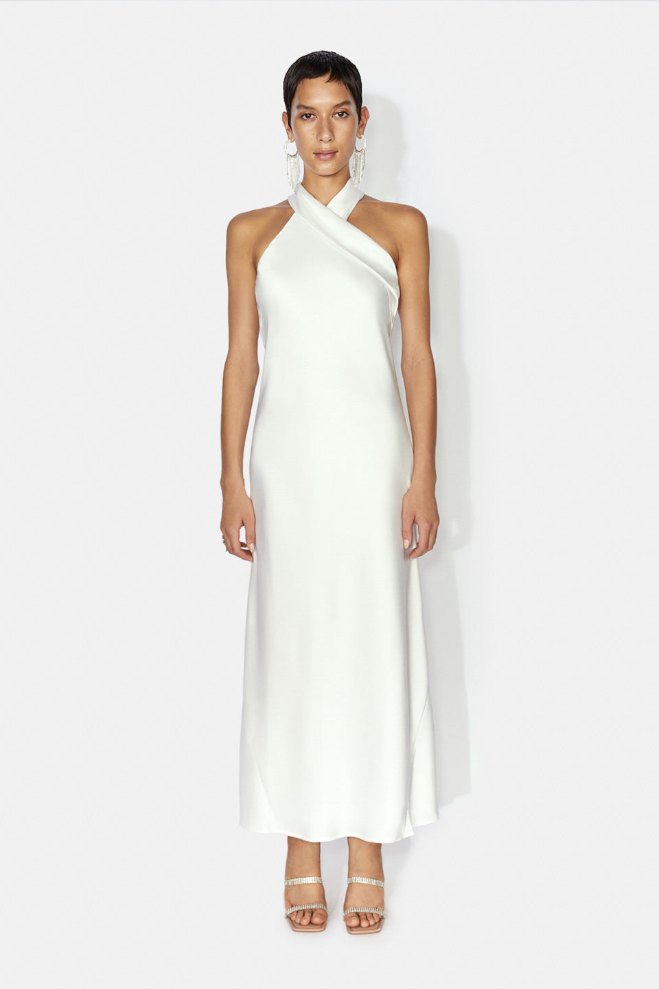The signature satin Pandora Bridal dress is reimagined with a modern cropped hemline. Cut on the bias for a beautiful drape, it features a contemporary halter neckline and cascading sash.