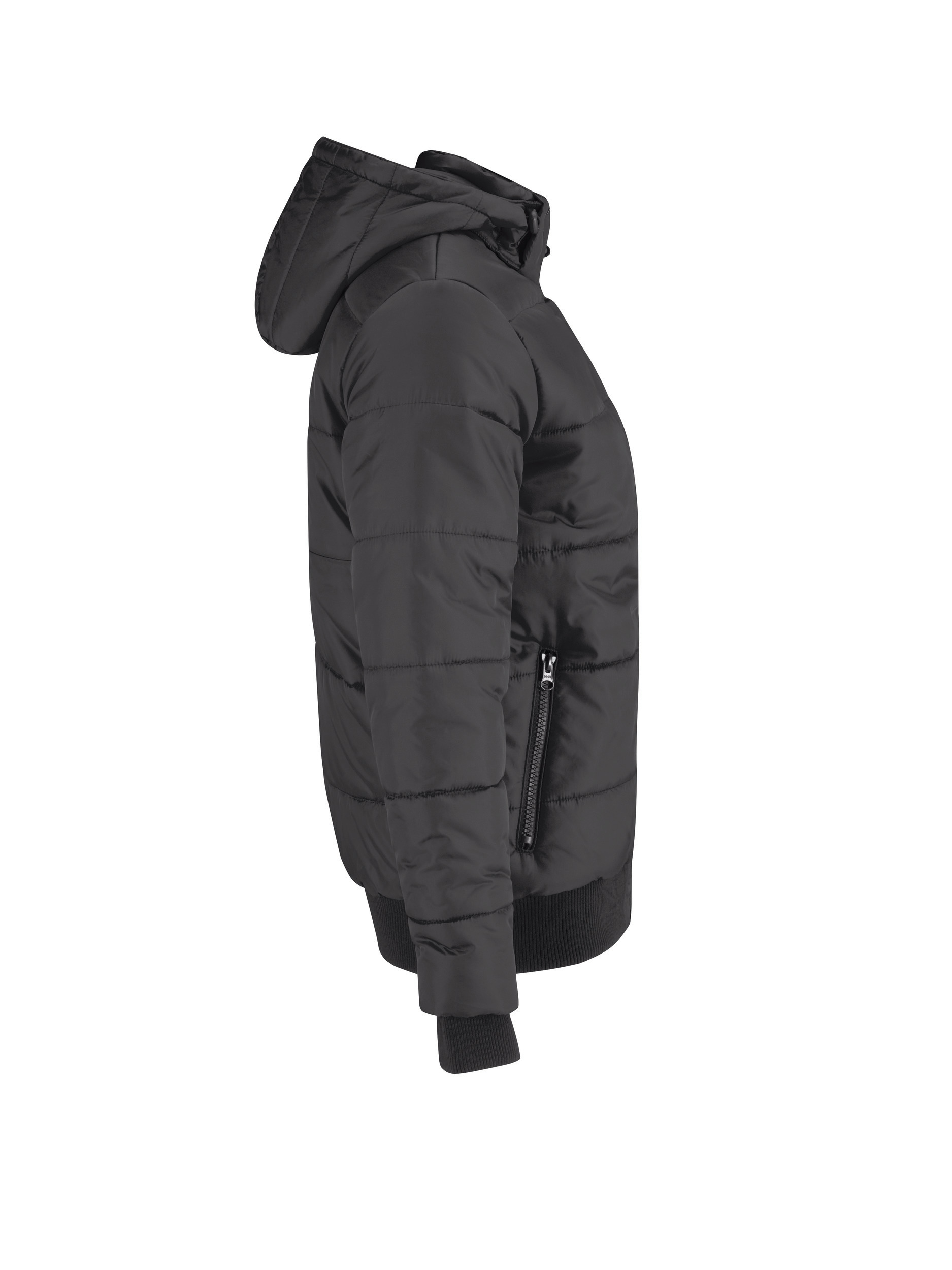 Couche extérieure : taffetas 300T 100% polyester avec enduit acrylique. Couche intérieure : taffetas rembourré 100 % polyester. Capuche rembourrée détachable et ajustable et patte intérieure anti-intempéries. 2 poches avant zippées et 1 poche portefeuille intérieure. Poignets et bord inférieur en coton/élasthanne côte 2×2. Zip SBS ton sur ton. Style « bomber » contemporain et coupe “retail” avec couleur extérieure unie et doublure intérieure contrastée. Accès facile pour décoration.