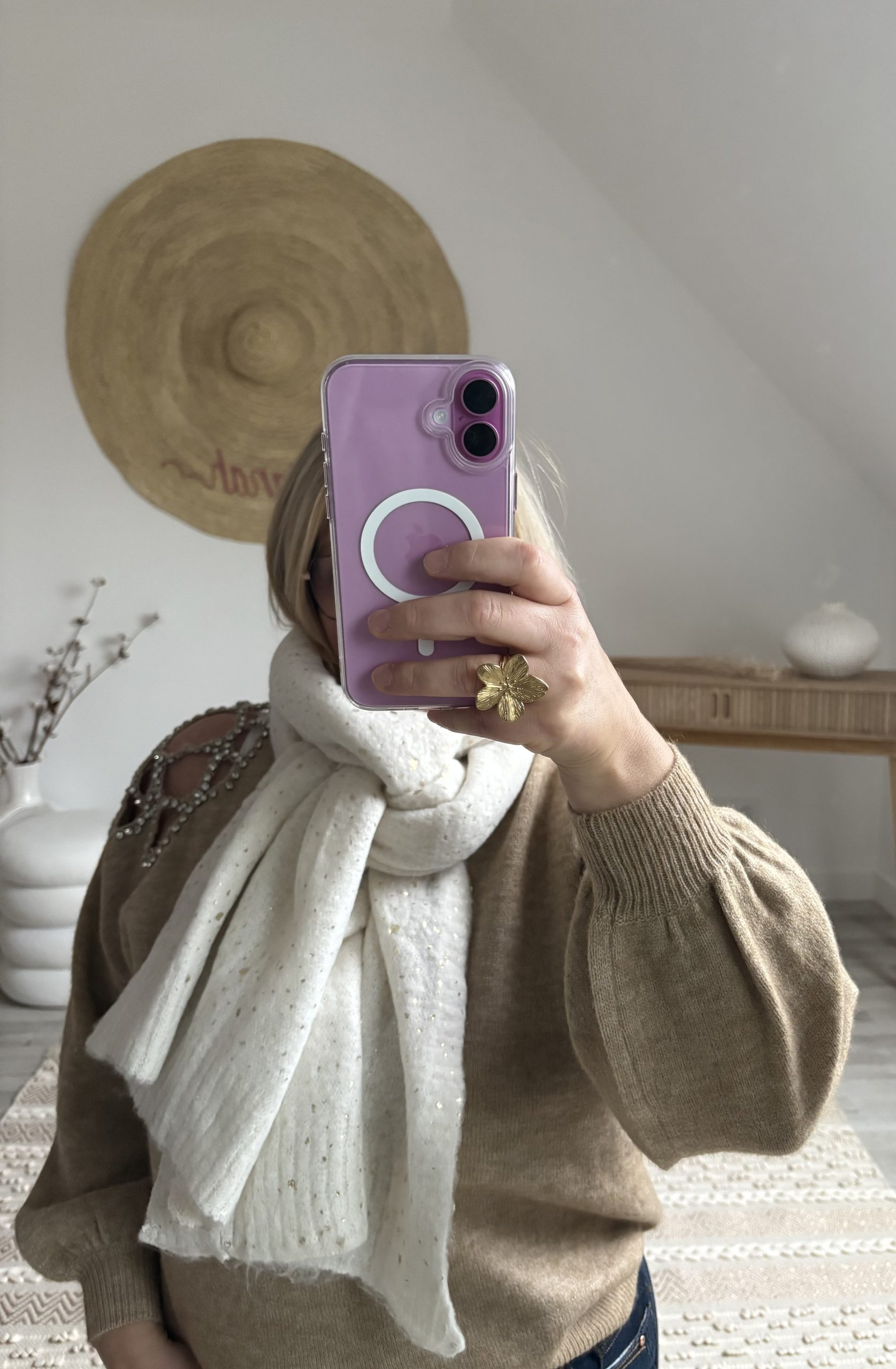 Découvrez les écharpes tricotées Milanah : élégantes, douces et confortables. Disponibles en taupe et écru avec détails dorés. Parfaites pour vos tenues hivernales, à seulement 18 € !