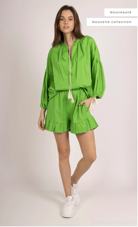 Chic et élégant, cet ensemble blouse et short pour femme, conçu en Italie pour la collection Printemps/Été 2025, mêle viscose et laine pour un confort optimal et une tenue parfaite en toute occasion.