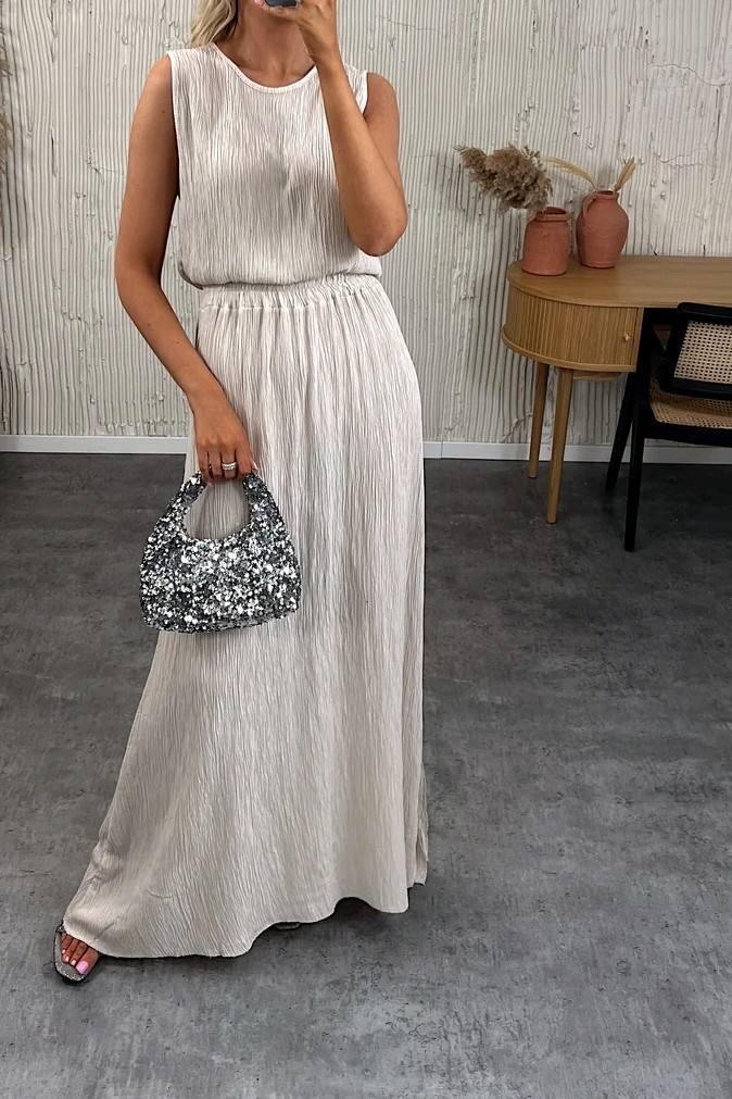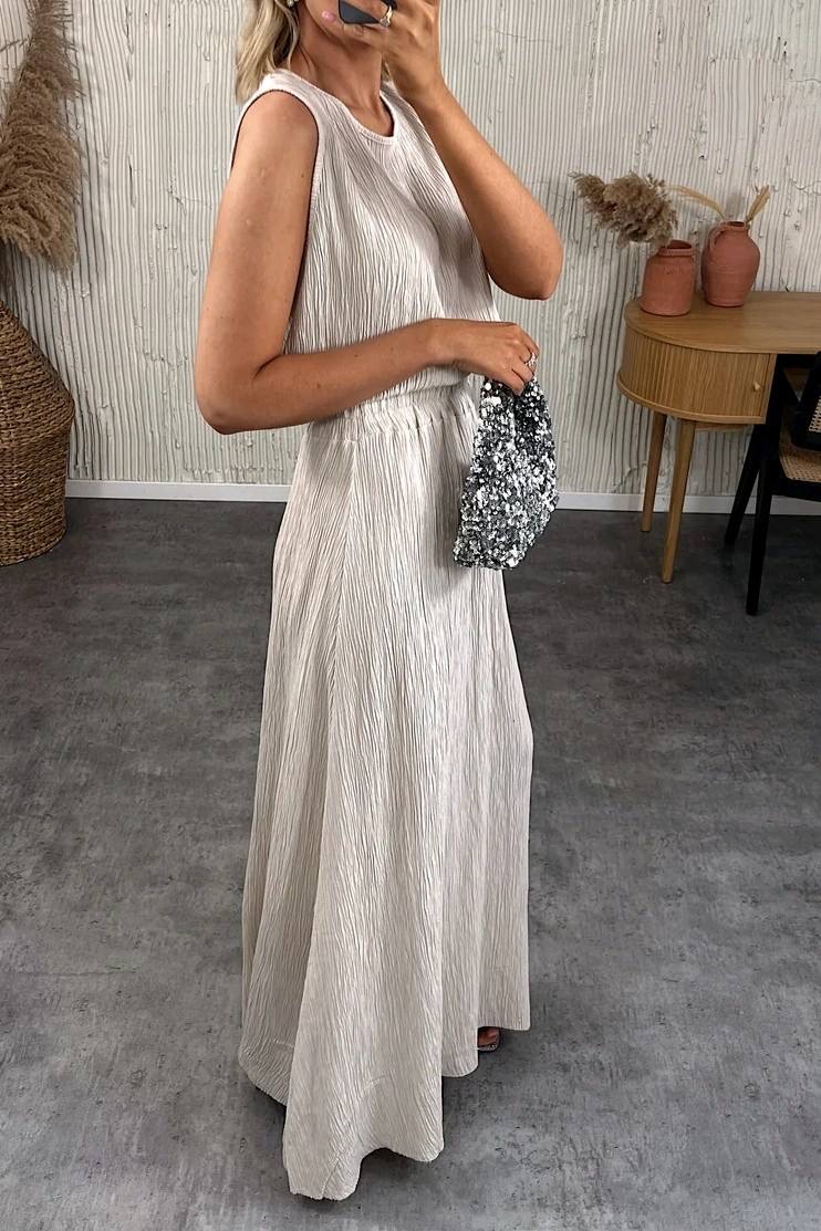Cet ensemble top et jupe est une vraie déclaration de style, parfait pour briller sous le soleil ou sous les étoiles. Son tissu légèrement pailleté capte la lumière avec subtilité, tandis que sa coupe fluide apporte une élégance décontractée. Le top sans manches au tombé droit s’associe à une jupe longue taille haute qui allonge la silhouette en douceur. On adore sa couleur intense et vibrante qui attire tous les regards. C’est l’ensemble idéal pour un événement estival, une soirée ou une escapade chic.