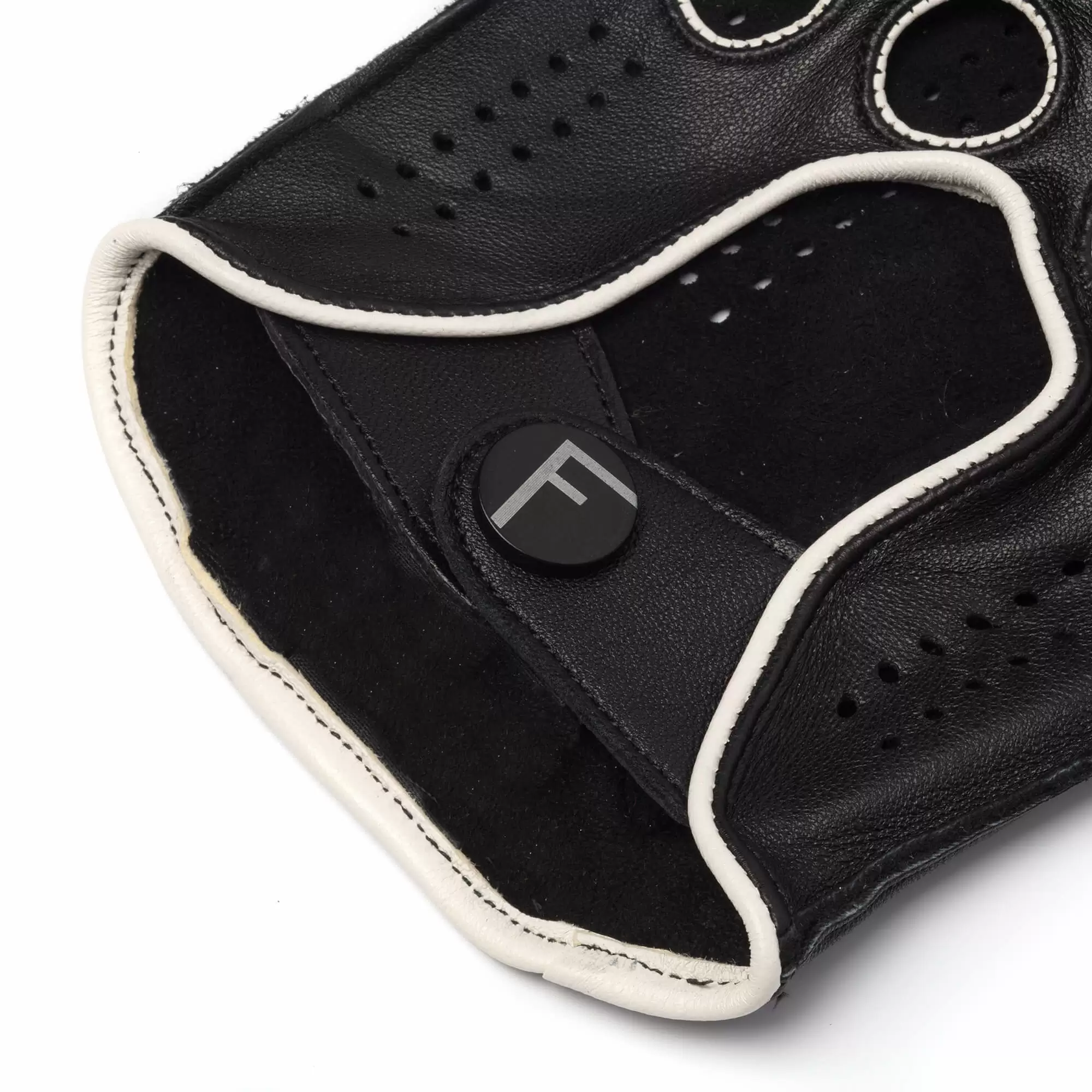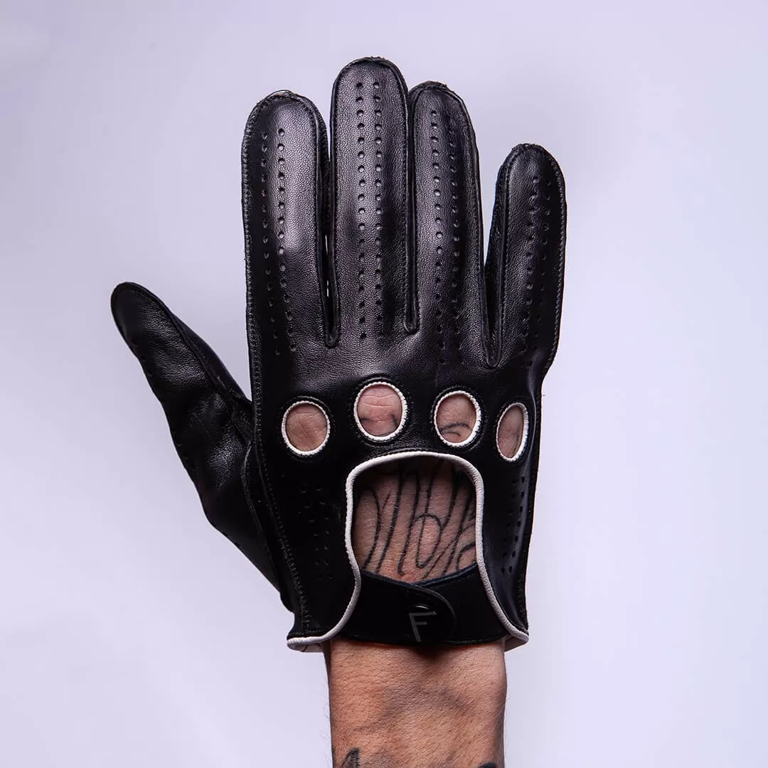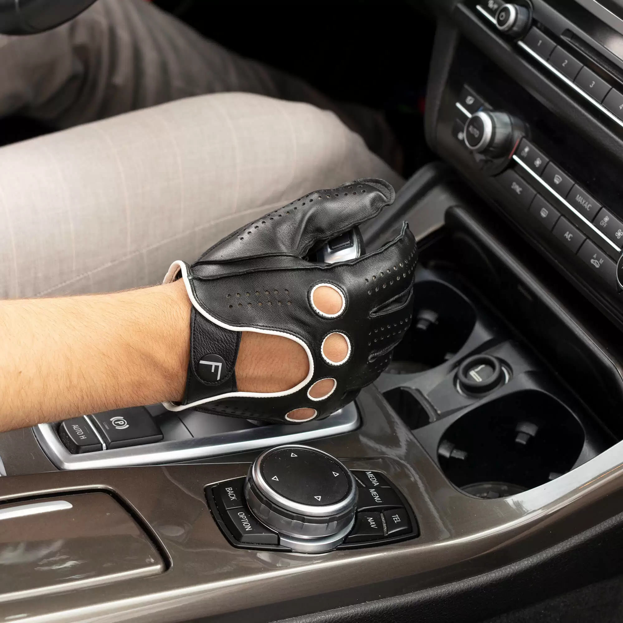 F1 (Heren) – Zwart Lederen Autohandschoenen met Witte Trim, Touch-functie, Cut-Out Rug & Knokkelgaten
