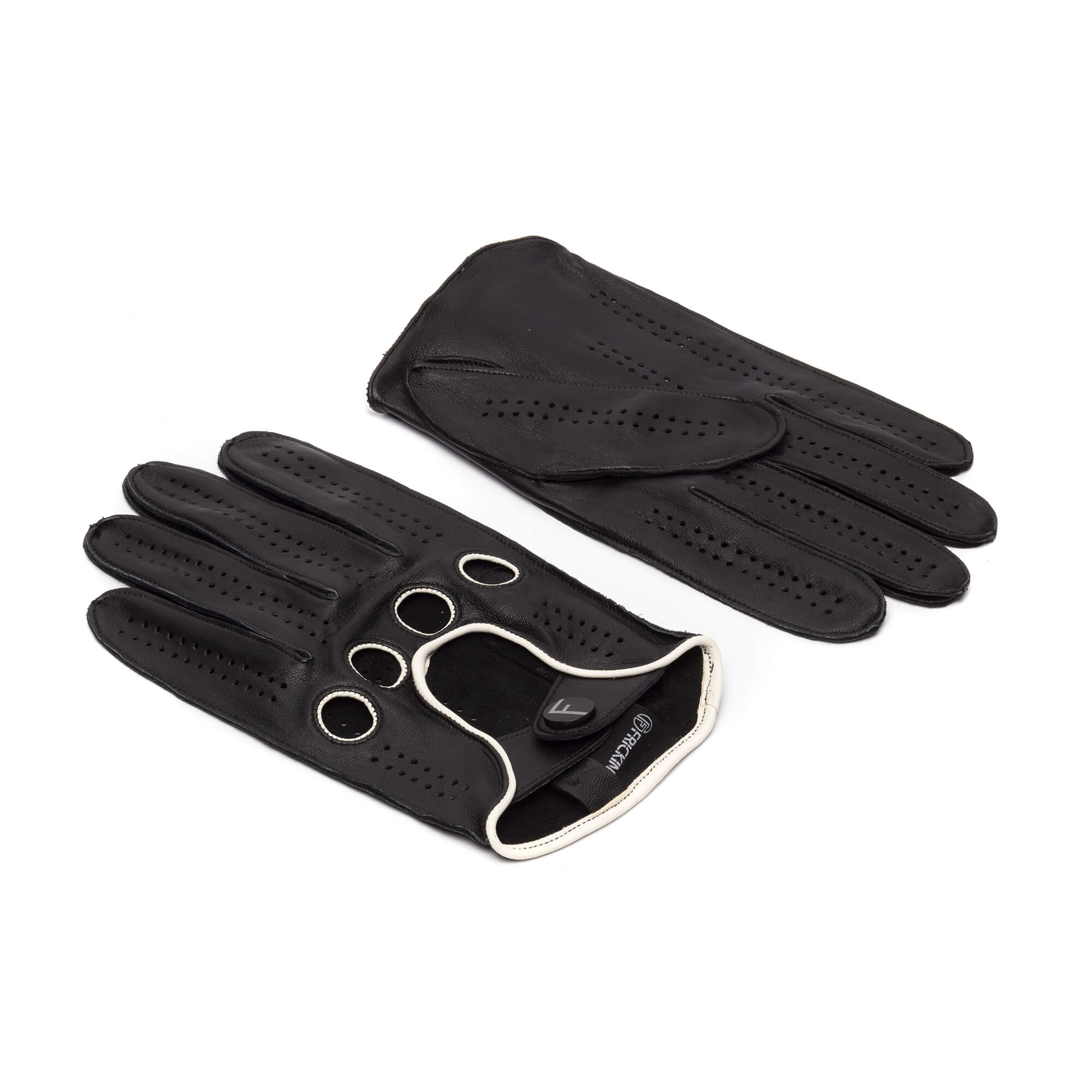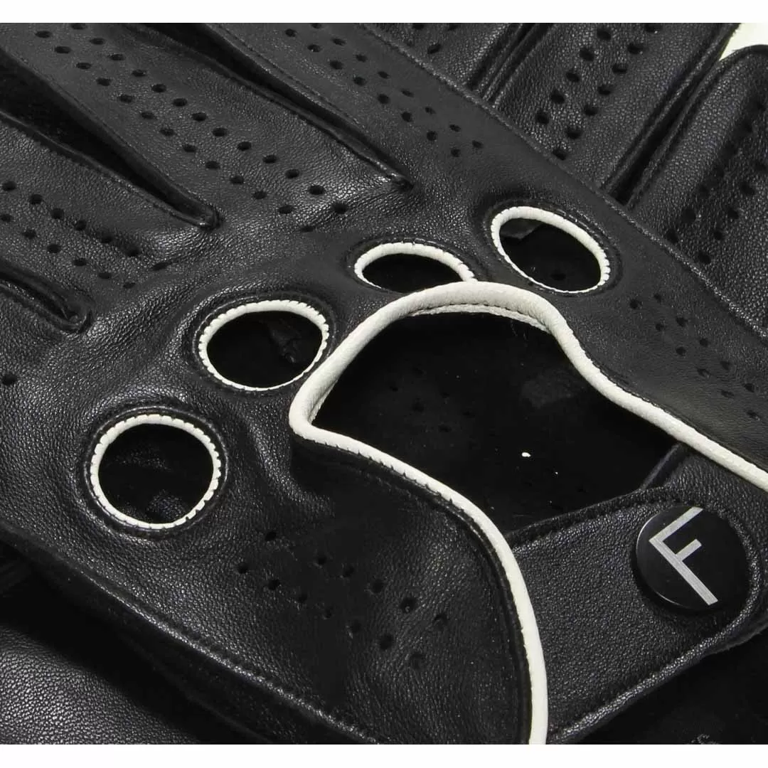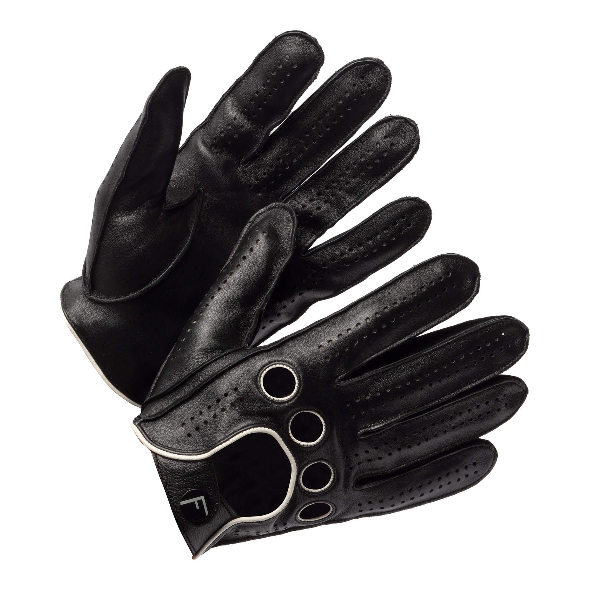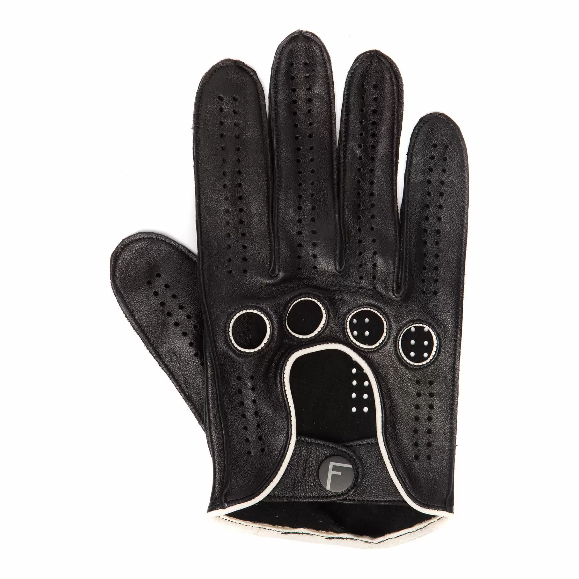F1 (Heren) – Zwart Lederen Autohandschoenen met Witte Trim, Touch-functie, Cut-Out Rug & Knokkelgaten