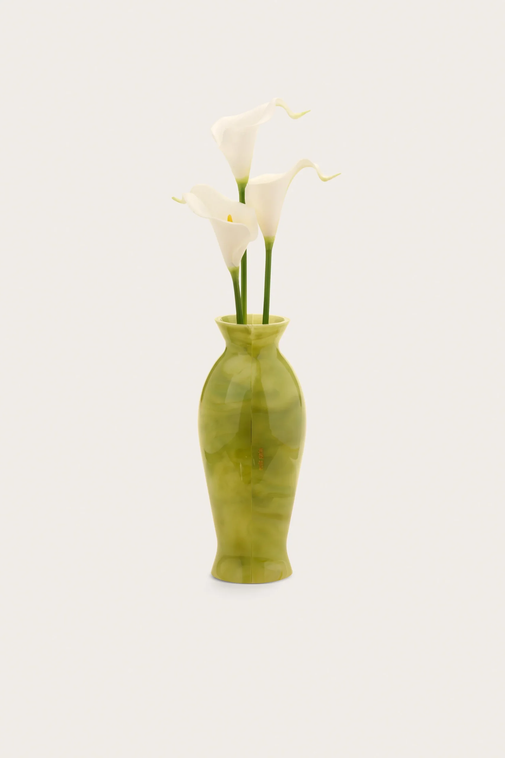 A marbled acrylic vase of calla lilies that opens for storage and functions as wearable art.