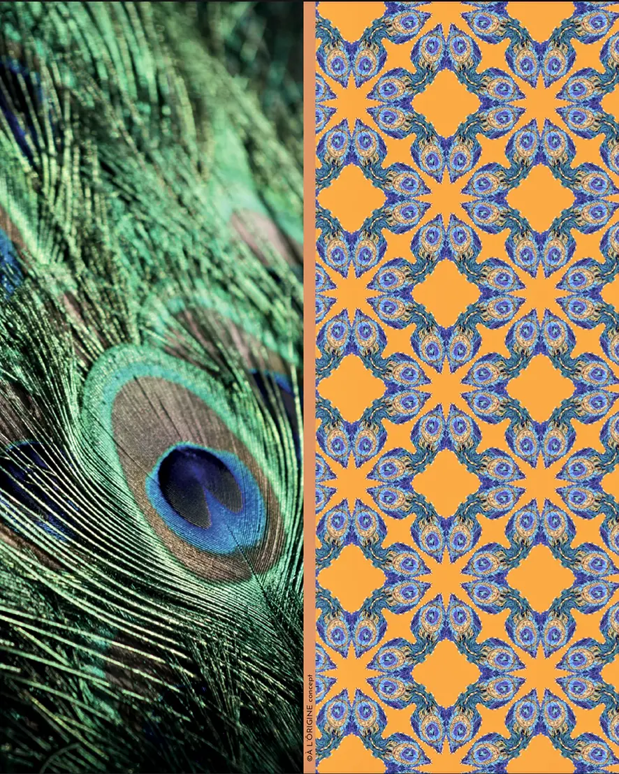 Avec le motif Plume de Paon, les couleurs en bleu et orange vous donnent une touche énergique, vous serez prête à déployer vos ailes !