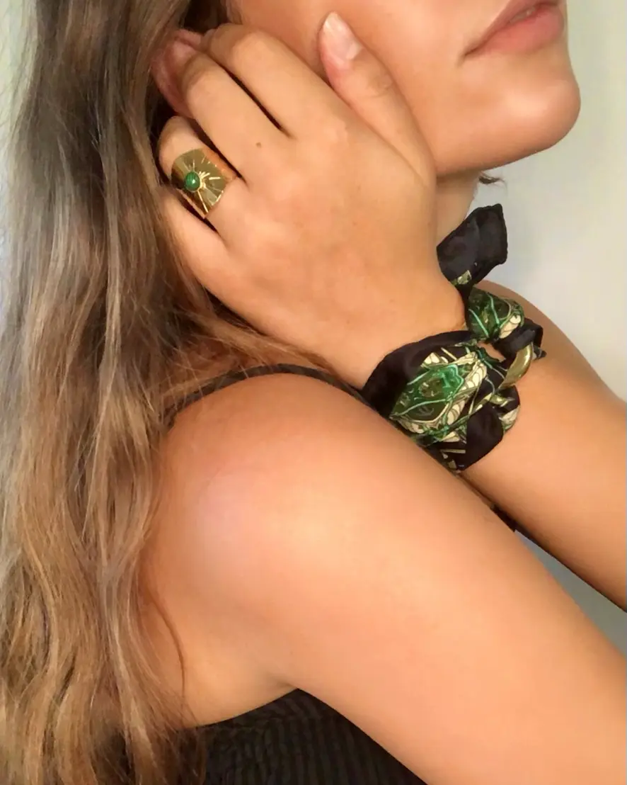 Avec le motif Filet de pêche, ses couleurs de vert émeraude, vert vif et noir vous permettent de mettre en lumière vos tenues tout au long de l’année.