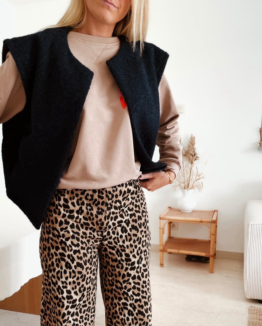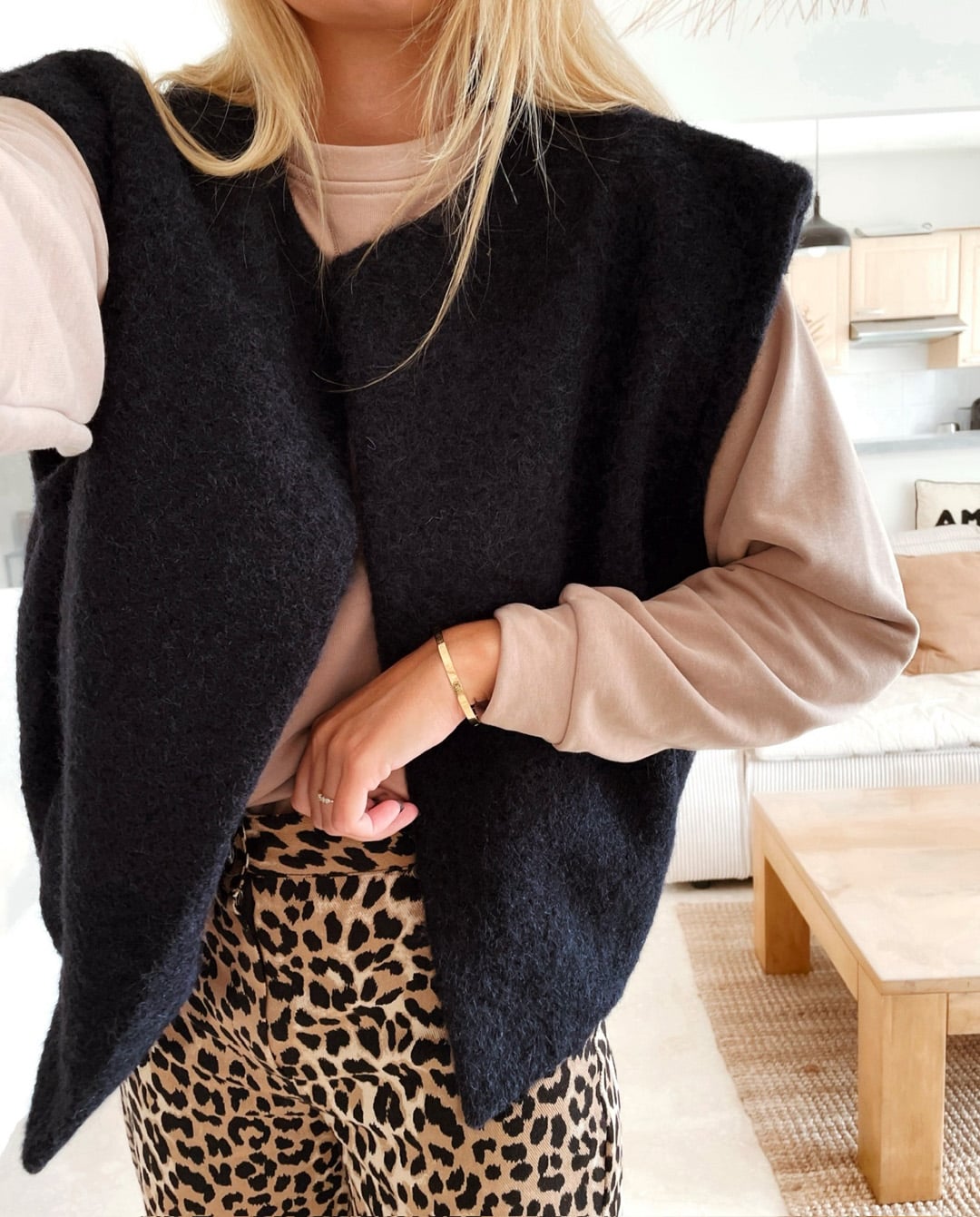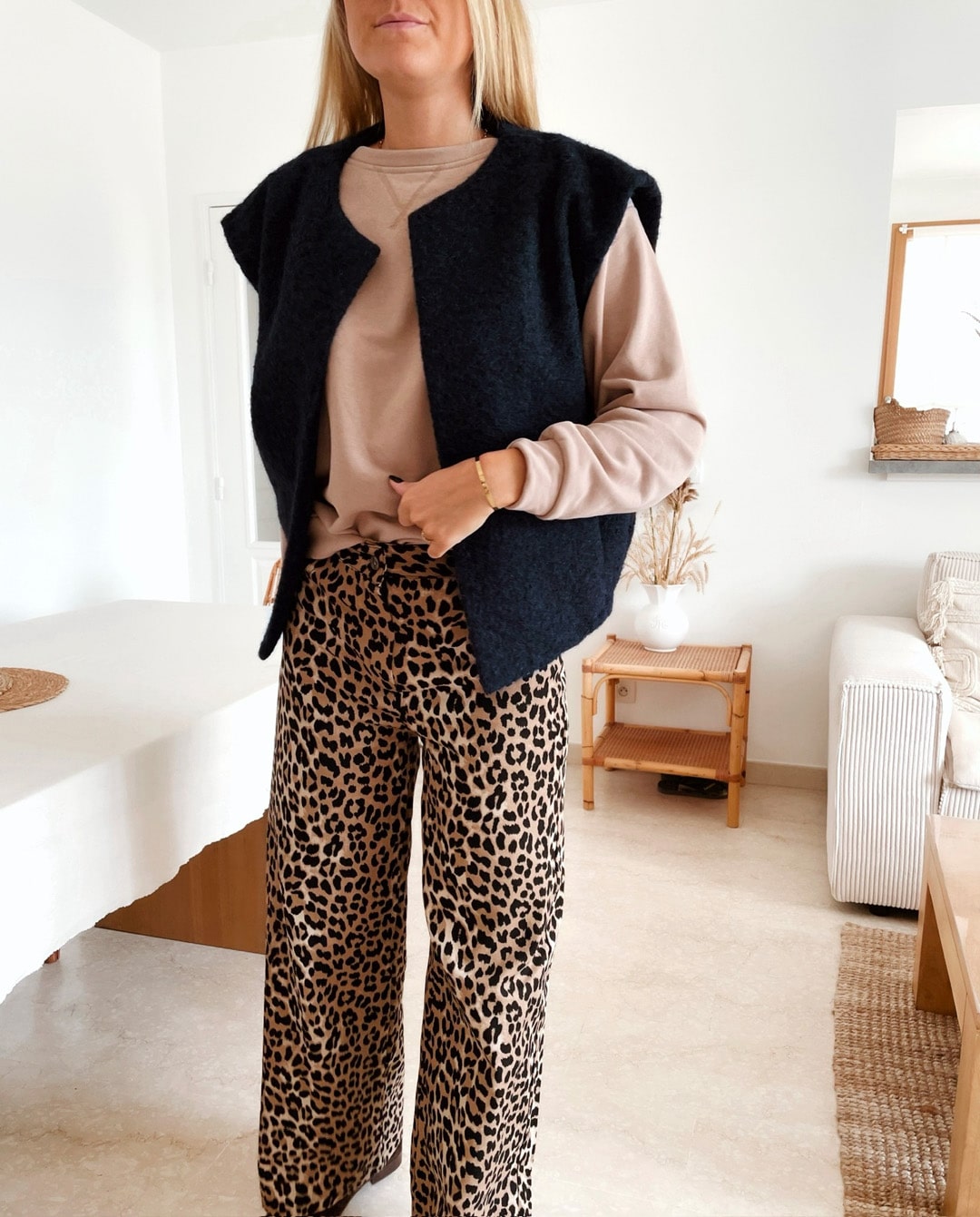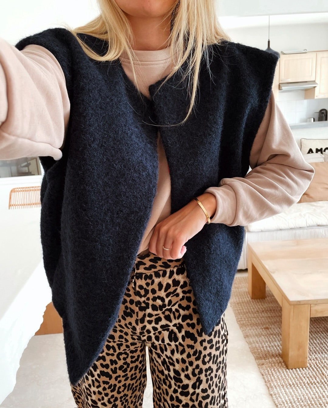 -Gilet ouvert bleu marine sans manche avec deux poches sur le côté.