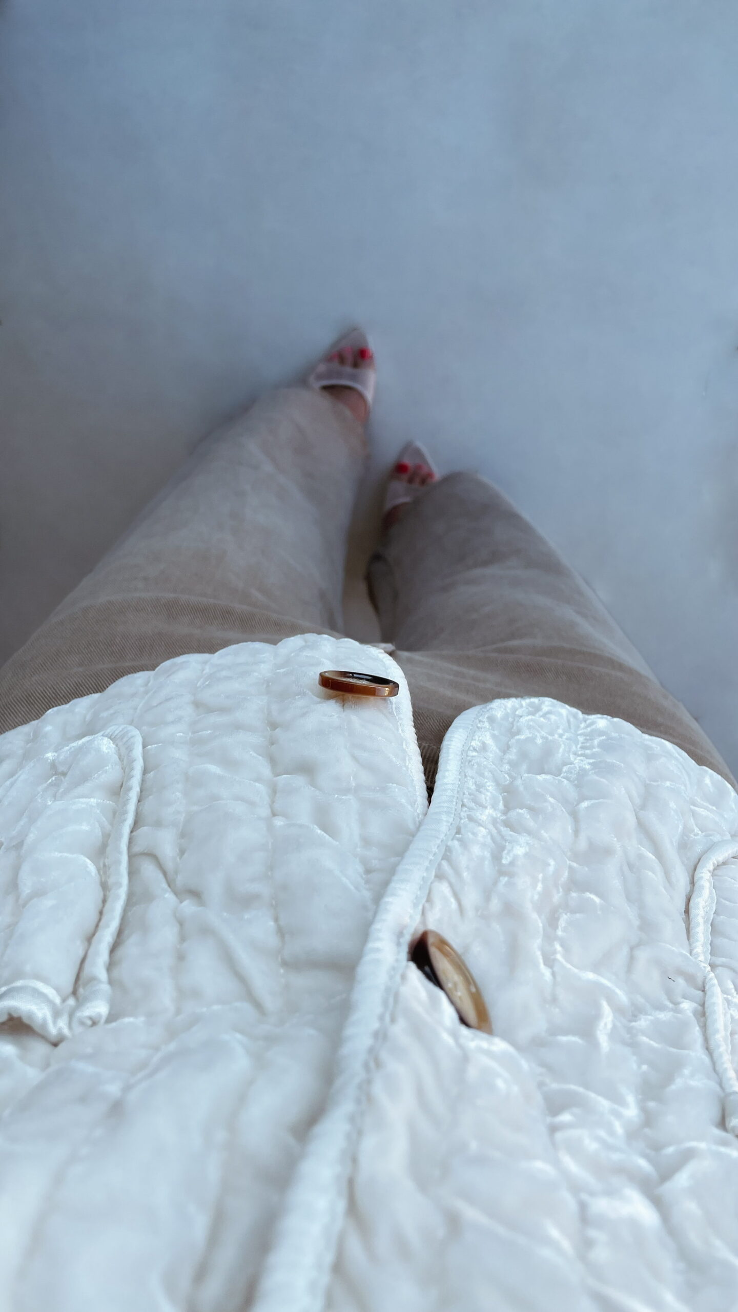 -Gilet velours couleur écru sans manche fermé avec des boutons.