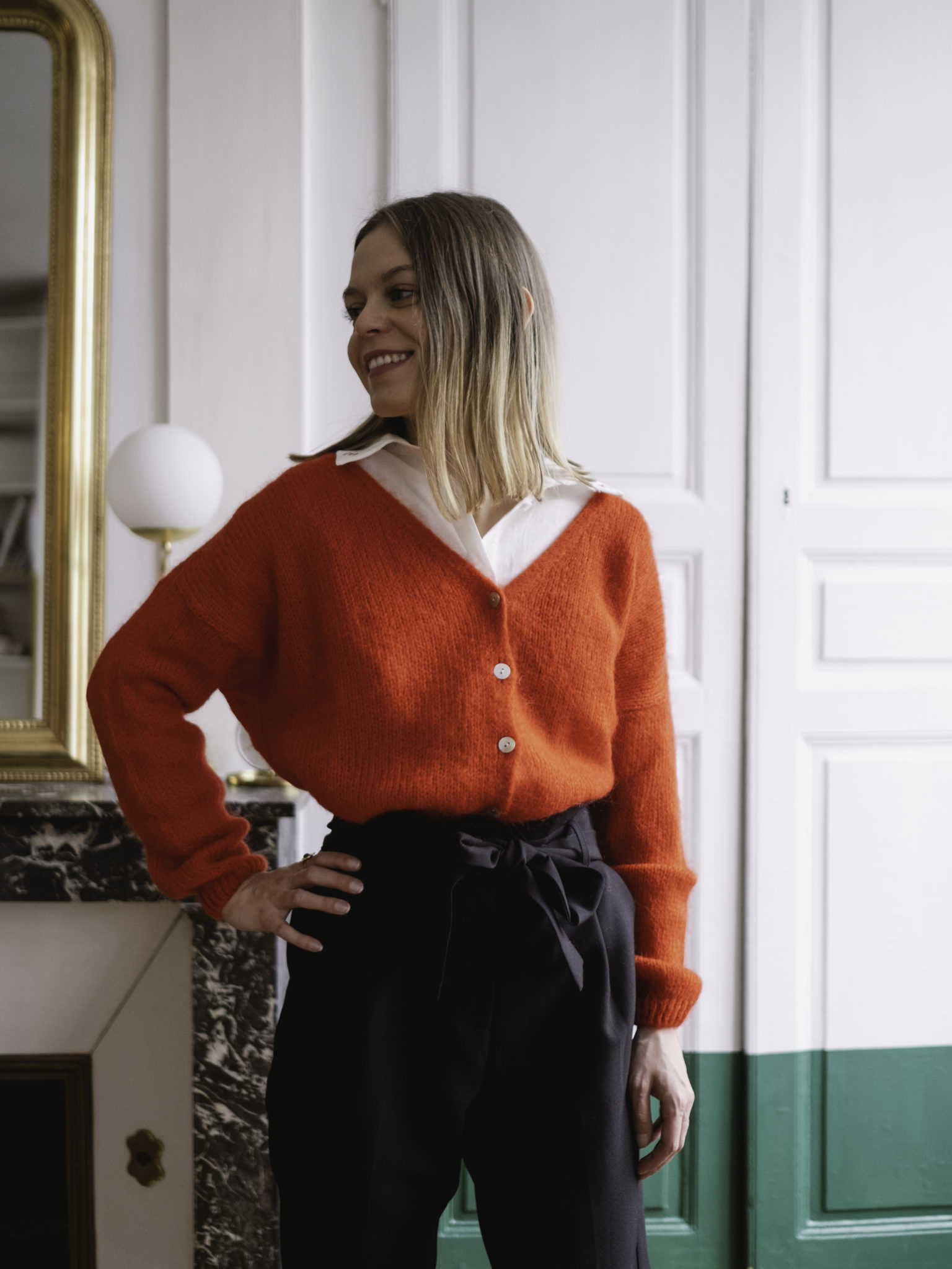 Notre gilet FOLK existe en plusieurs couleurs. Il se porte ouvert ou fermé avec les boutons nacrés. C’est une pure douceur.