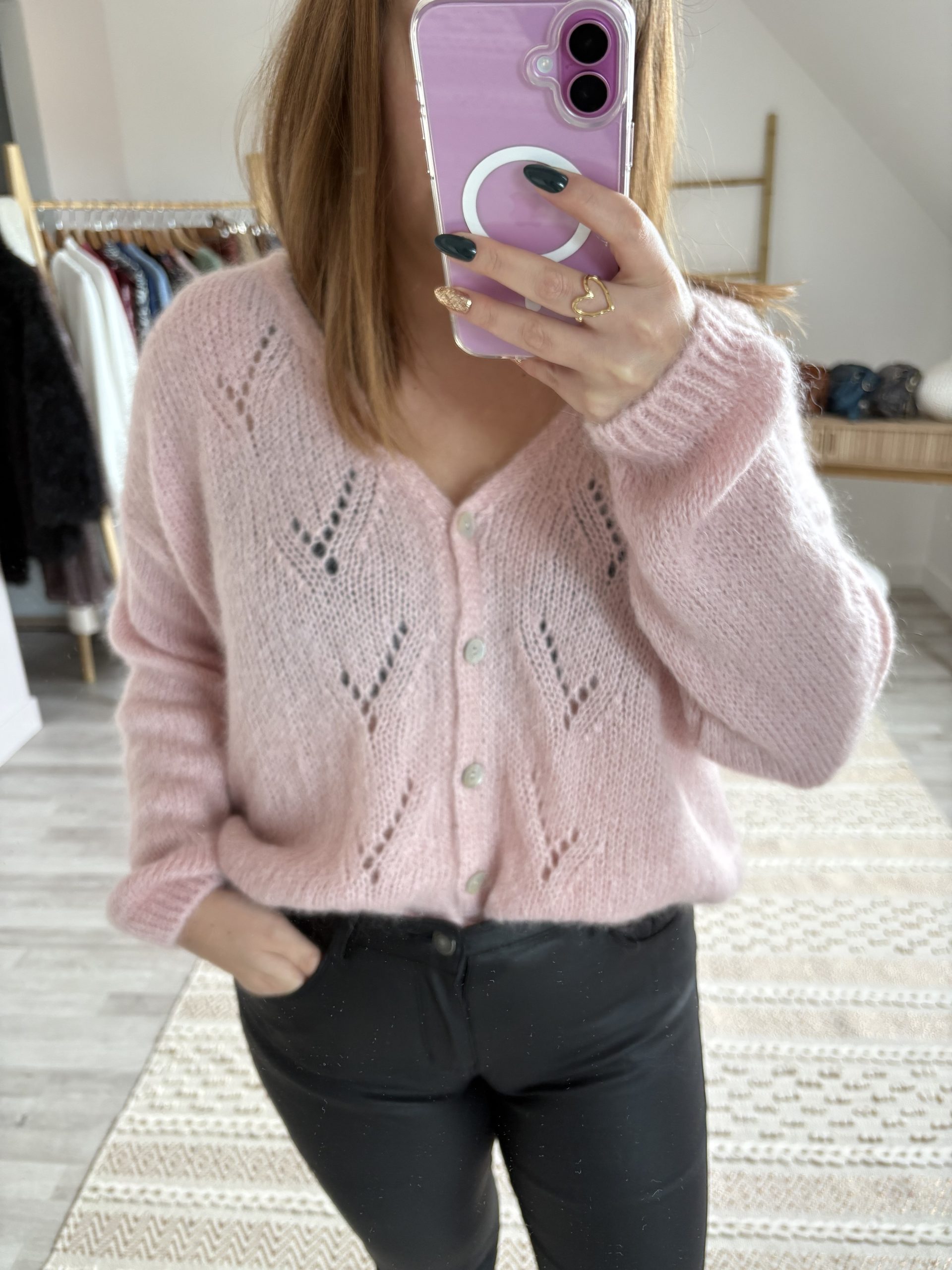Envie de porter l’un des plus doux gilets en maille femme ? Découvrez le gilet Carla de Milanah. Composé à 30 % de mohair, il offre une maille fantaisie moelleuse et réconfortante. Disponible en Rose Blush ou Vert, il s’adapte du 36 au 42..