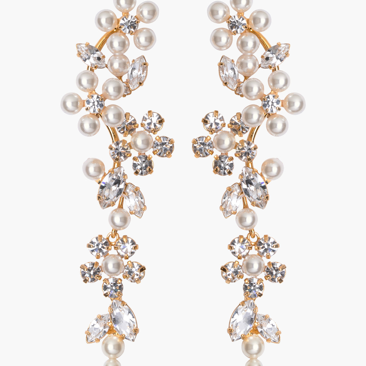 The Jacinthe Earrings bring the idyllic charm of a daisy bouquet to life in a wearable floral arrangement. They are plated in an antique gold finish to give the pearls a distinct warmth, further ignited by sparkling crystals. Made by hand in New York, each stone is intentionally placed to frame the face, with a flattering lengthening effect. Dimensions: 3.25″ in length.