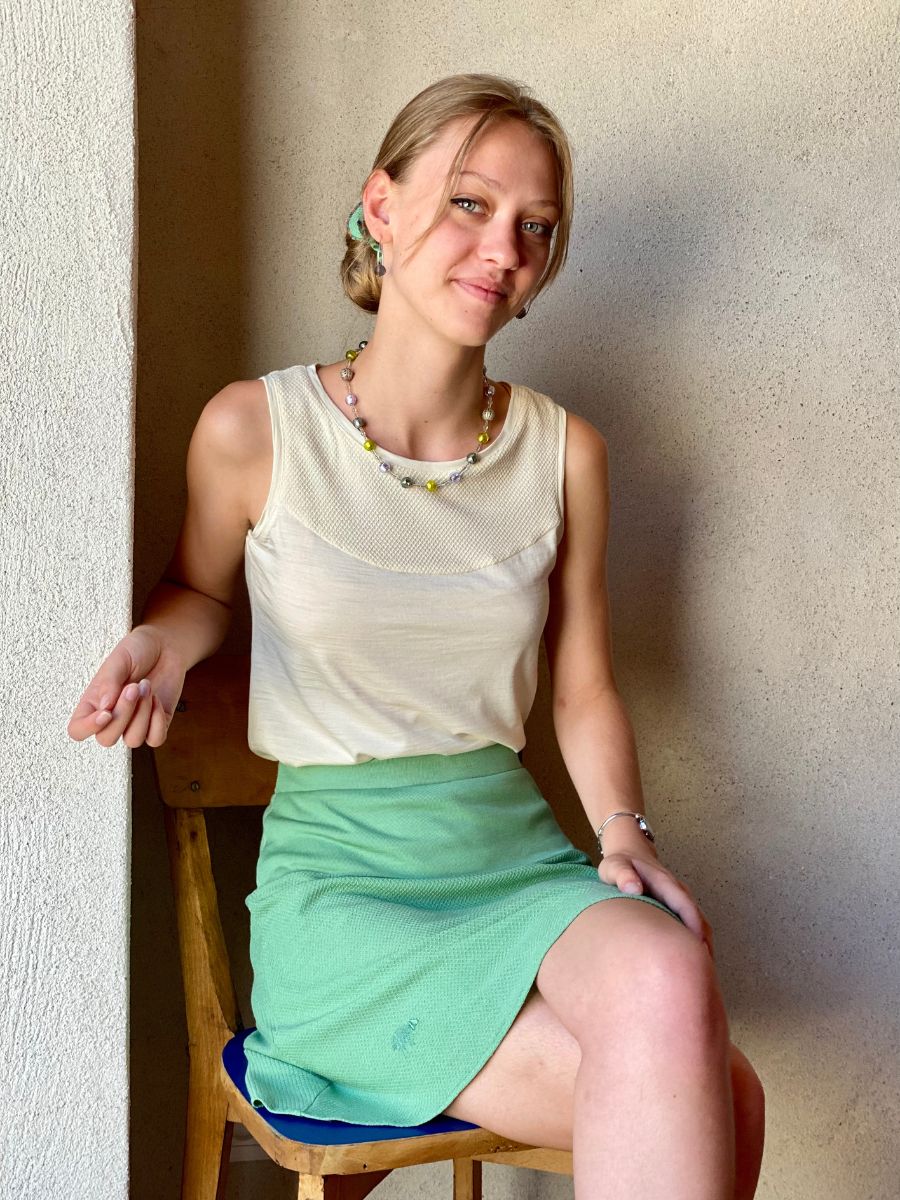 Voilà la jupe femme en mérinos bio et soie naturelle incontournable, celle qu’on porte partout et tout le temps, à la ville comme à la plage, jambes nues quand il fait bon, avec notre legging quand le frais se fait sentir !