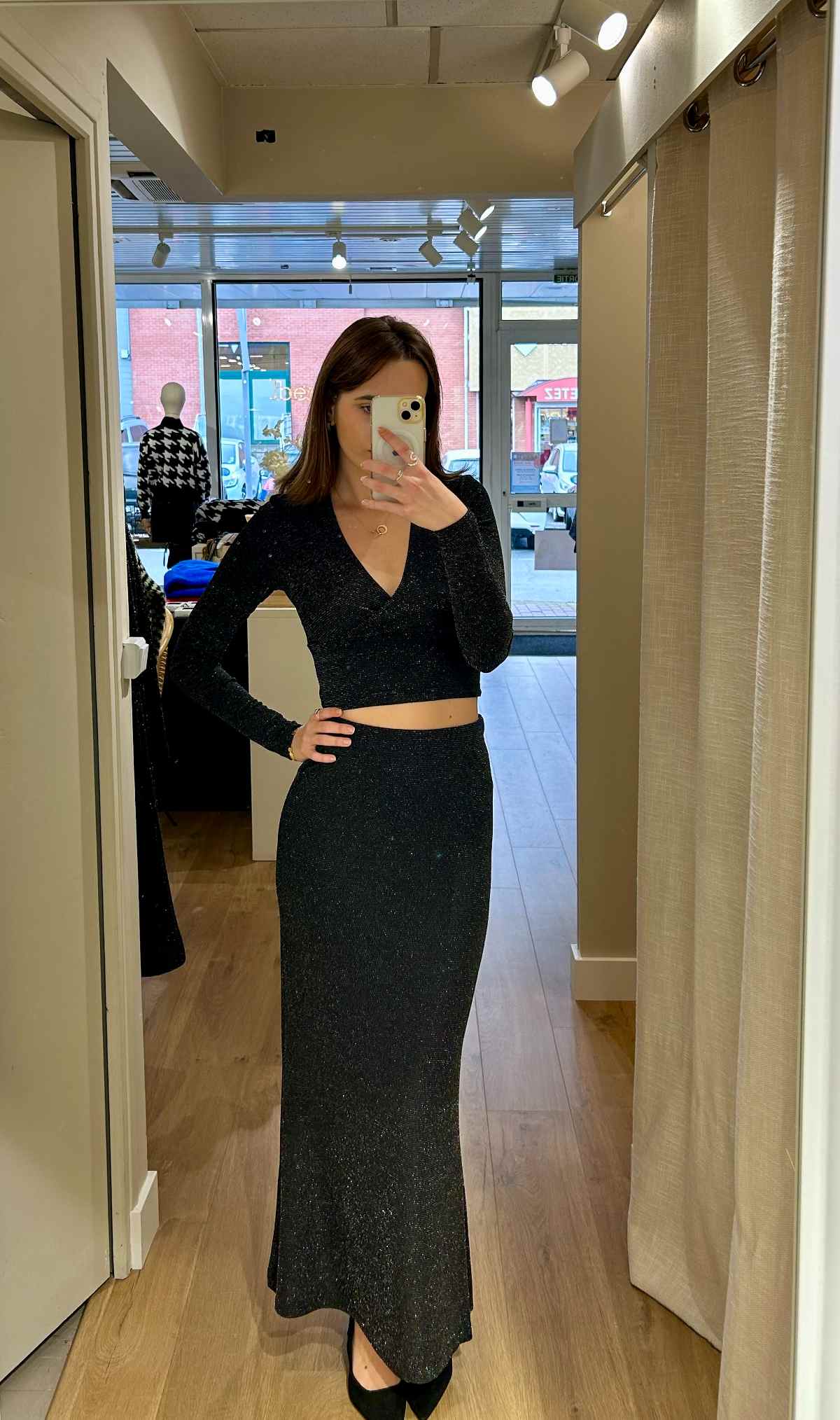 Sa matière fluide et ses paillettes scintillantes créent une allure glamour et raffinée, parfaite pour attirer tous les regards.