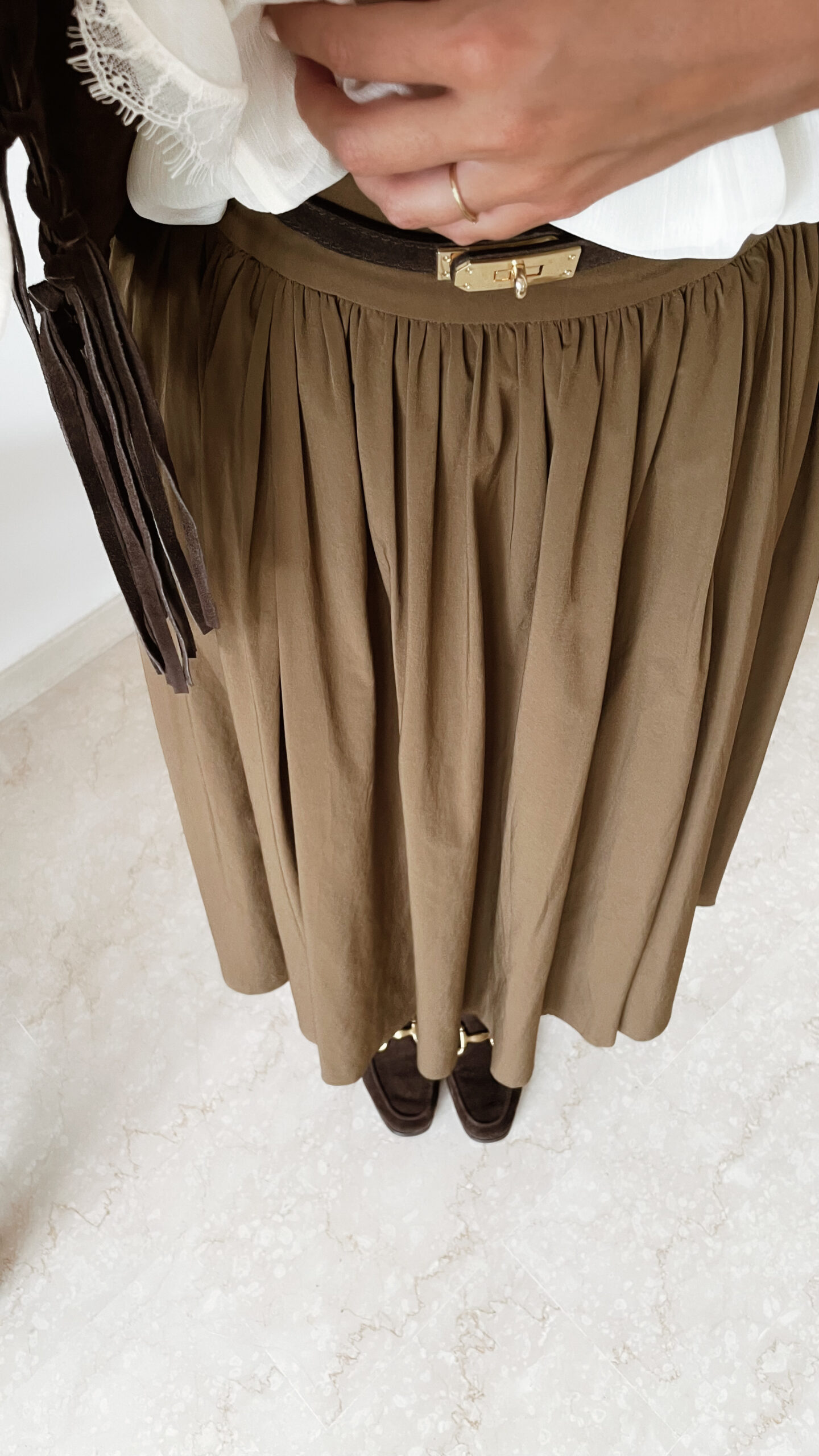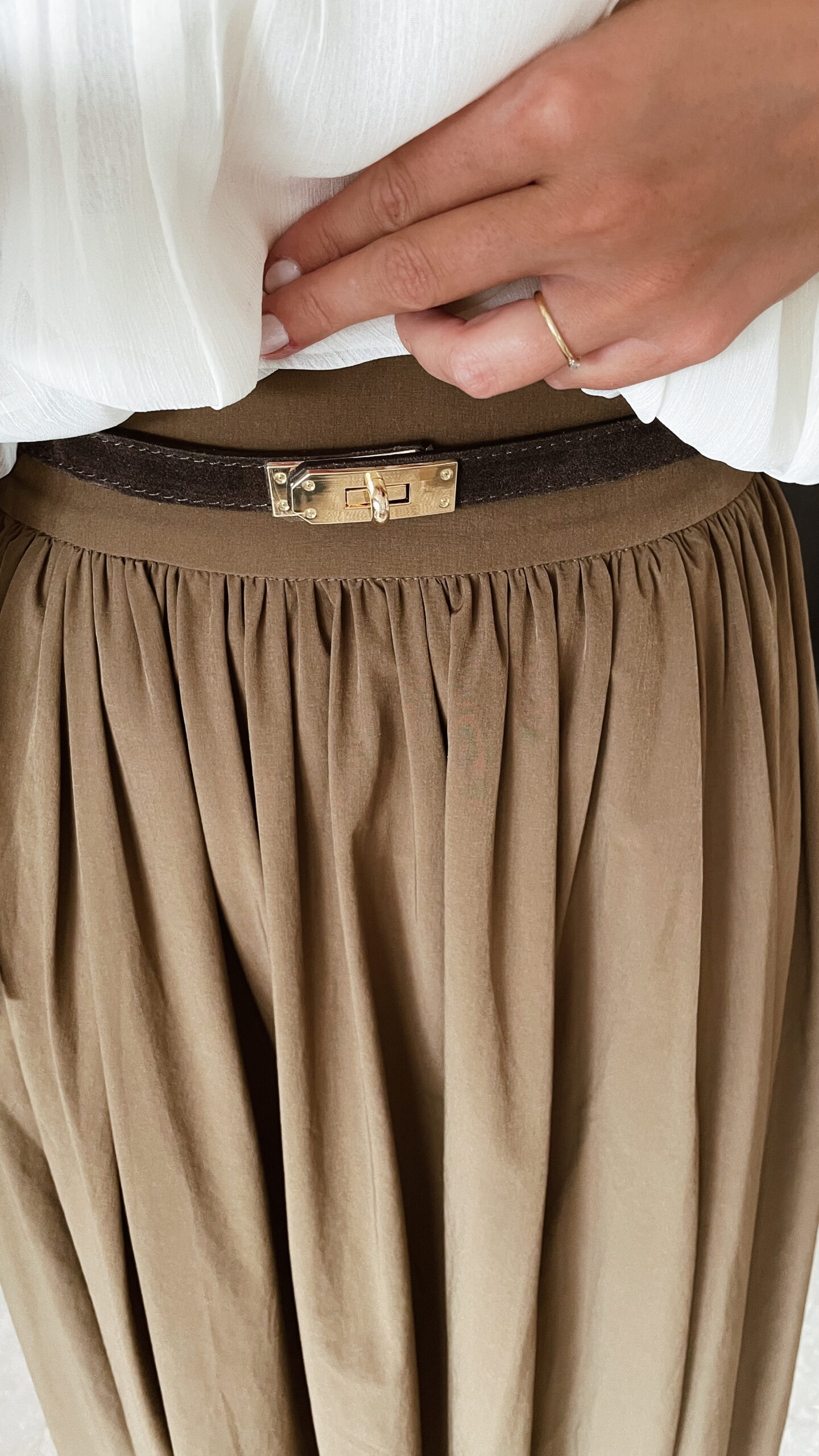 -La jupe Olive Katy est portée avec la chemise écrue Cézanne et la ceinture marron en daim.