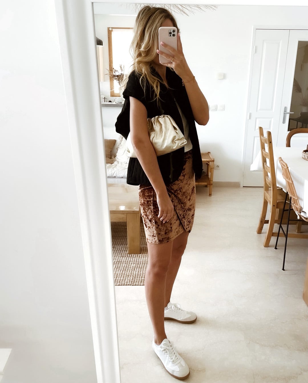 Le mannequin mesure 1m74 et porte la Taille 1 pour son 36/38 habituel. La Jupe Mordoré Rita est associée avec le t-shirt love tigre, le gilet sans manche brodé noir Tom et le sac en raphia Paola beige qui existe aussi en 2 autres coloris : rose; écru.