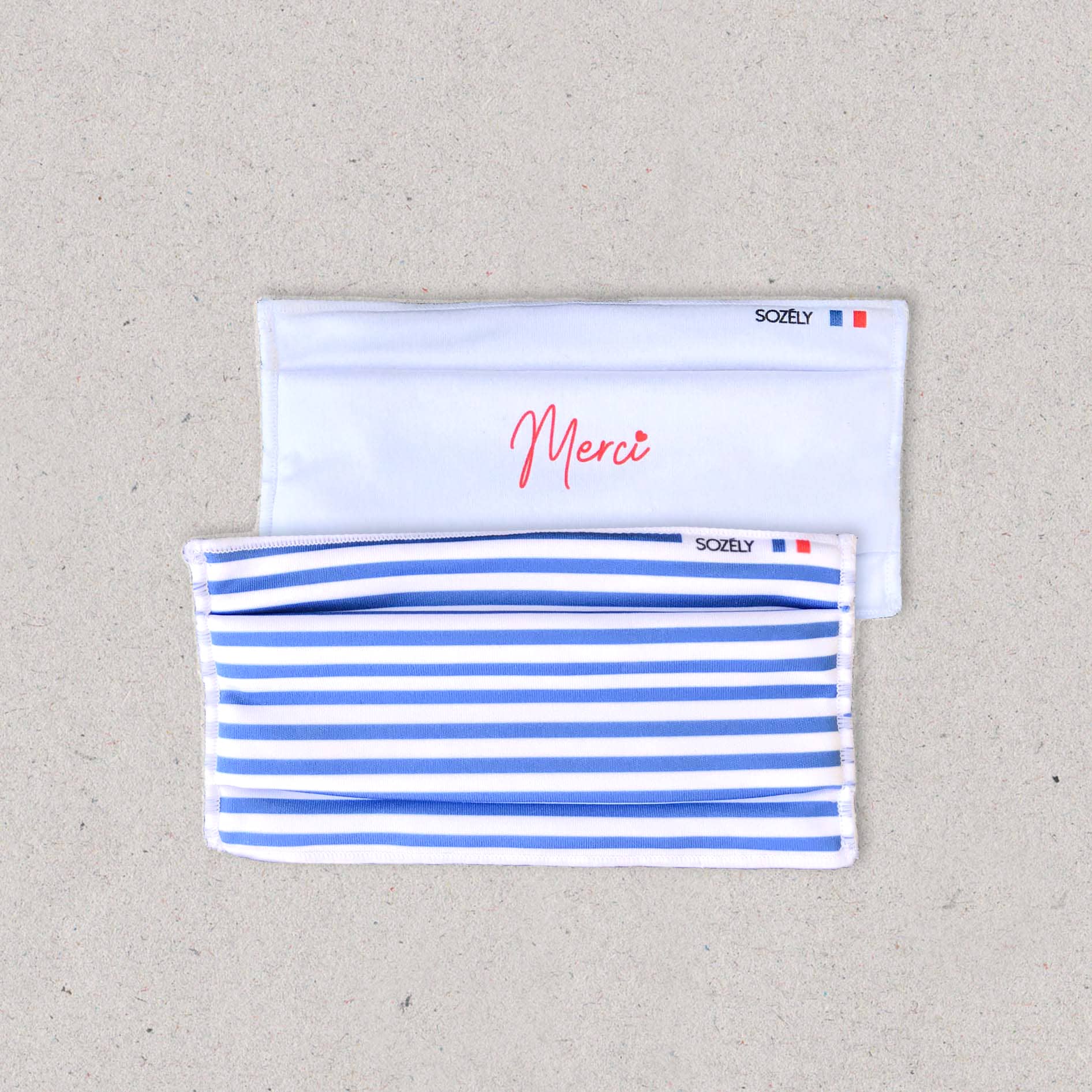Lot de deux masques de protection en tissu réutilisables et lavables jusqu’à 50 fois. Dans ce lot vous retrouverez Le Marin Bleu & Le Merci.
