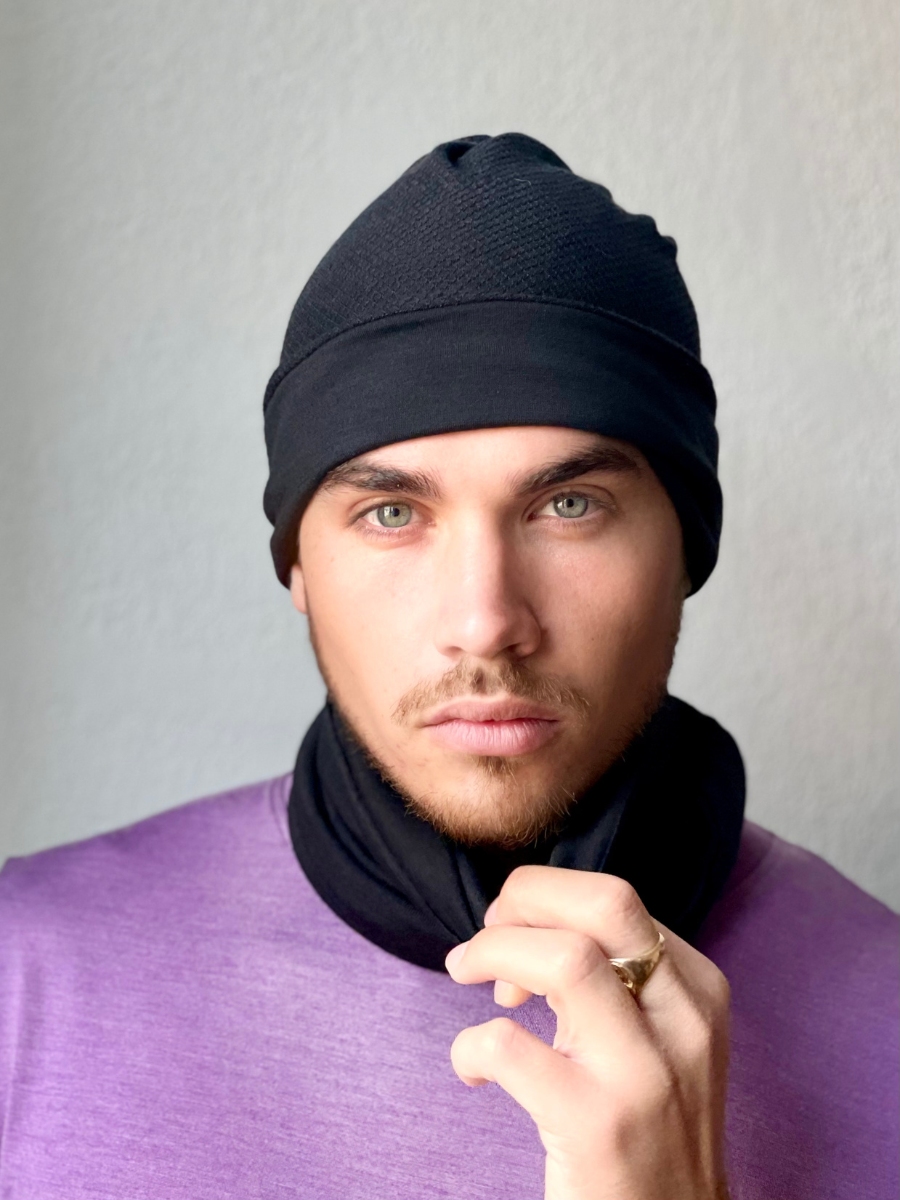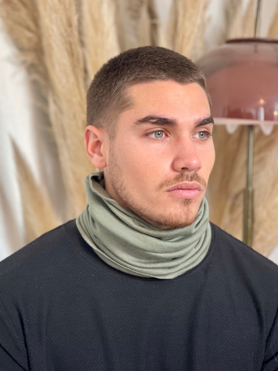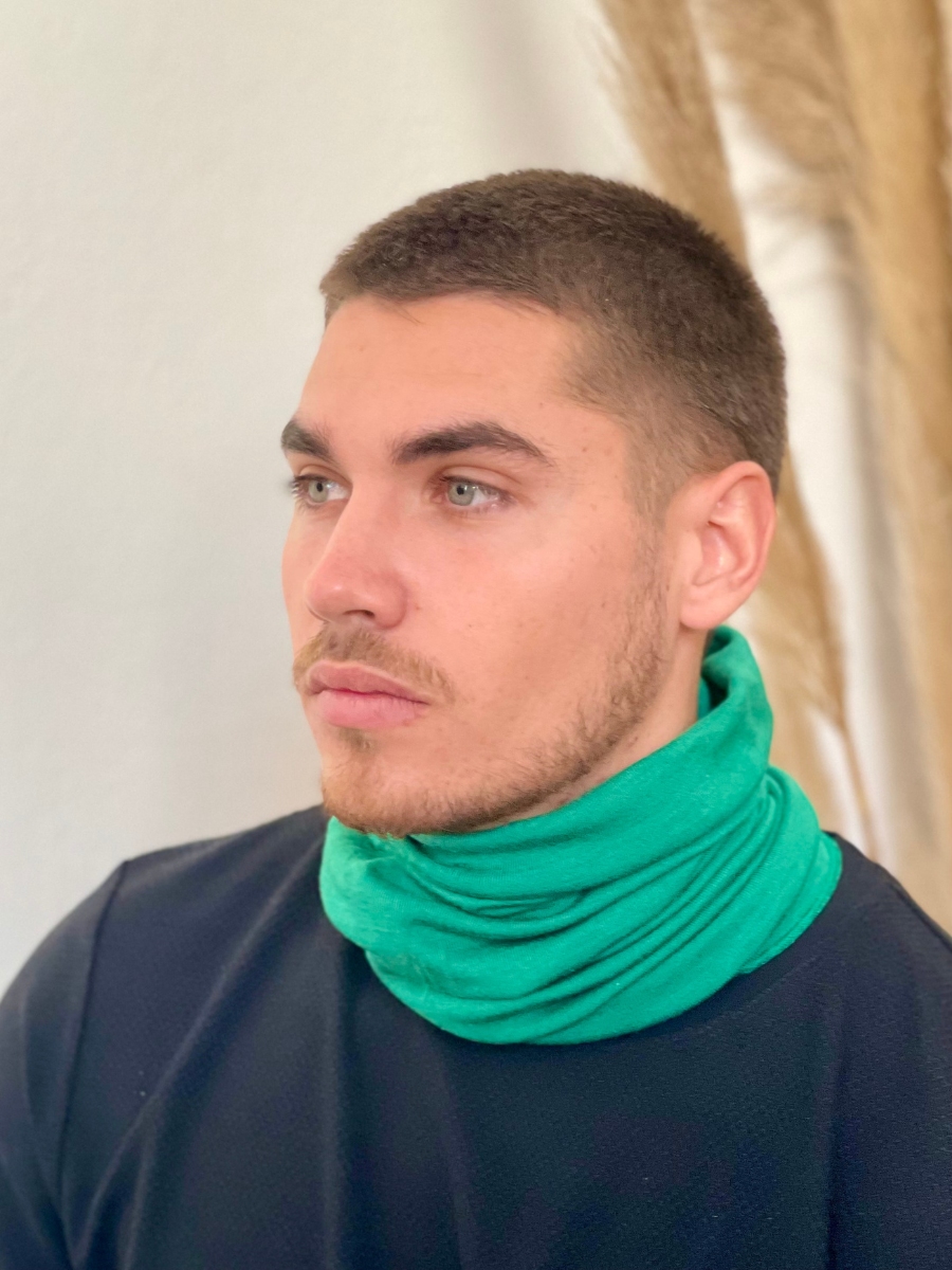 Confectionné en côte ou en jersey Lycra, le Maxitube en laine mérinos bio et soie peut s’utiliser en tour de cou, bonnet, cagoule, cache oreilles, protège-nez..