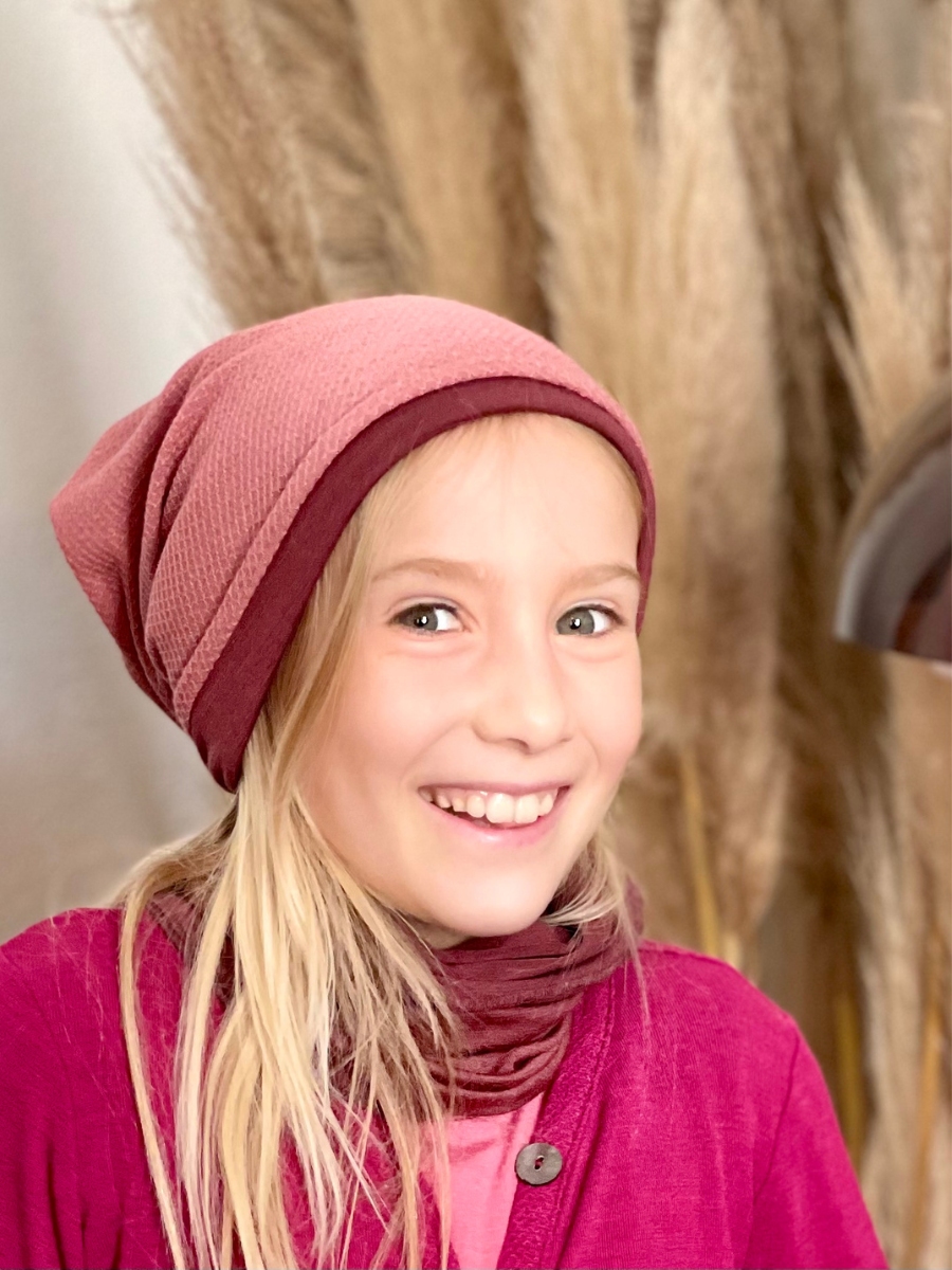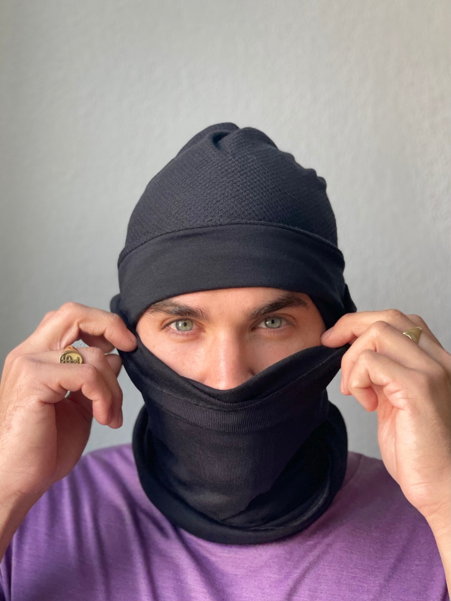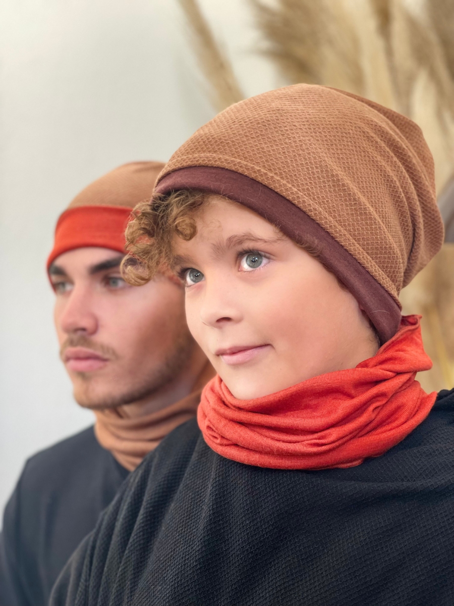 Confectionné en côte ou dans notre jersey Lycra, le Maxitube en laine mérinos bio et soie peut s’utiliser en tour de cou, bonnet, cagoule, cache oreilles, protège-nez..