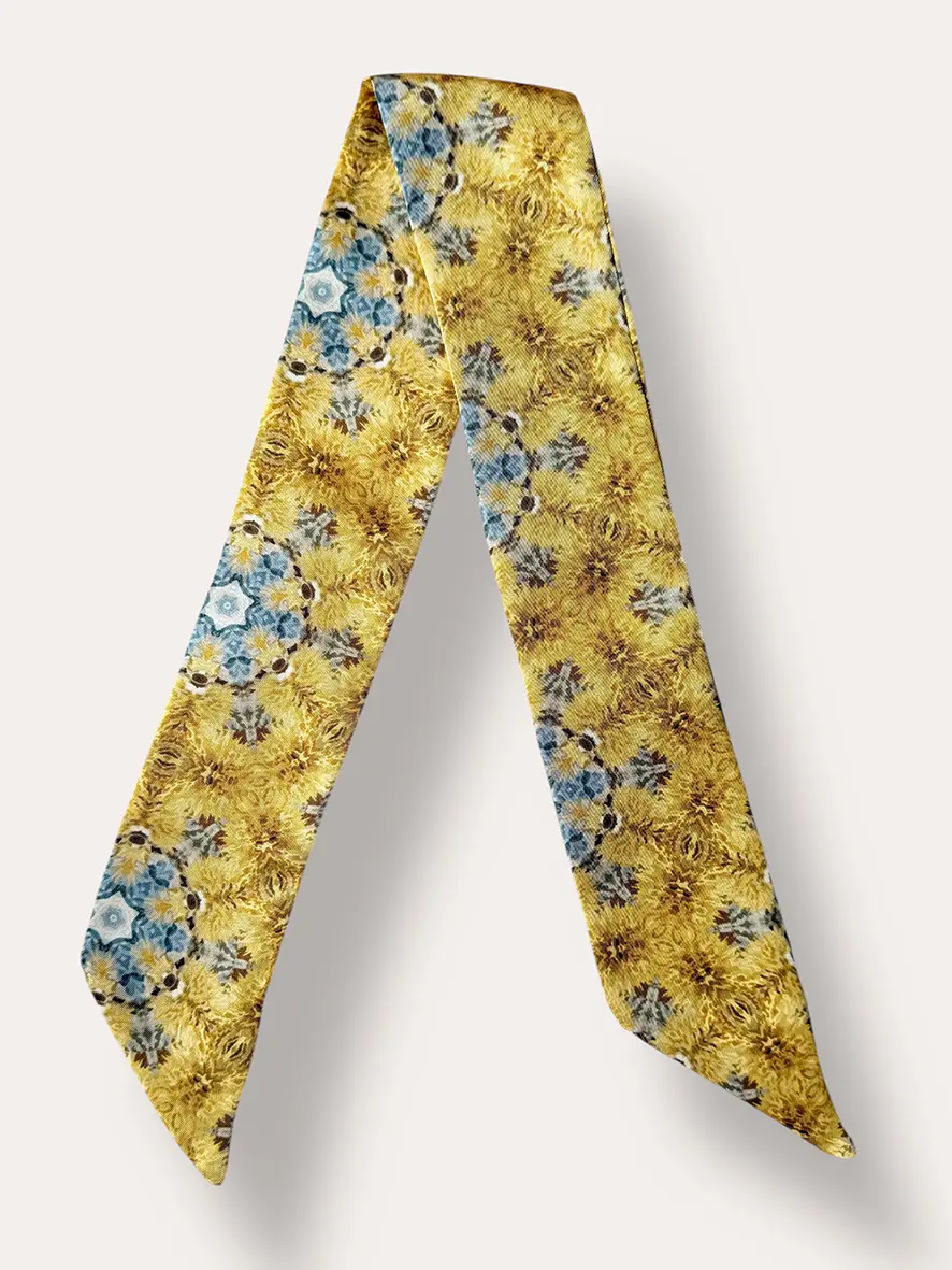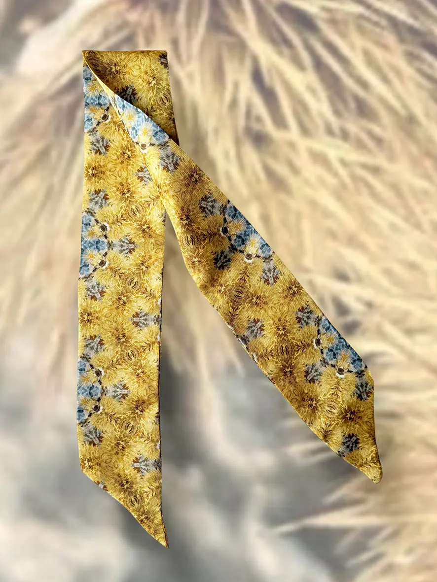 Toujours en soie de belle qualité, ce mini twilly est imprimé avec soin pour préserver l’éclat des couleurs et la finesse du dessin original. Chaque pièce est produite en petite série, je reste fidèle à mon envie de proposer une création artisanale responsable, pensée pour durer et se transmettre.