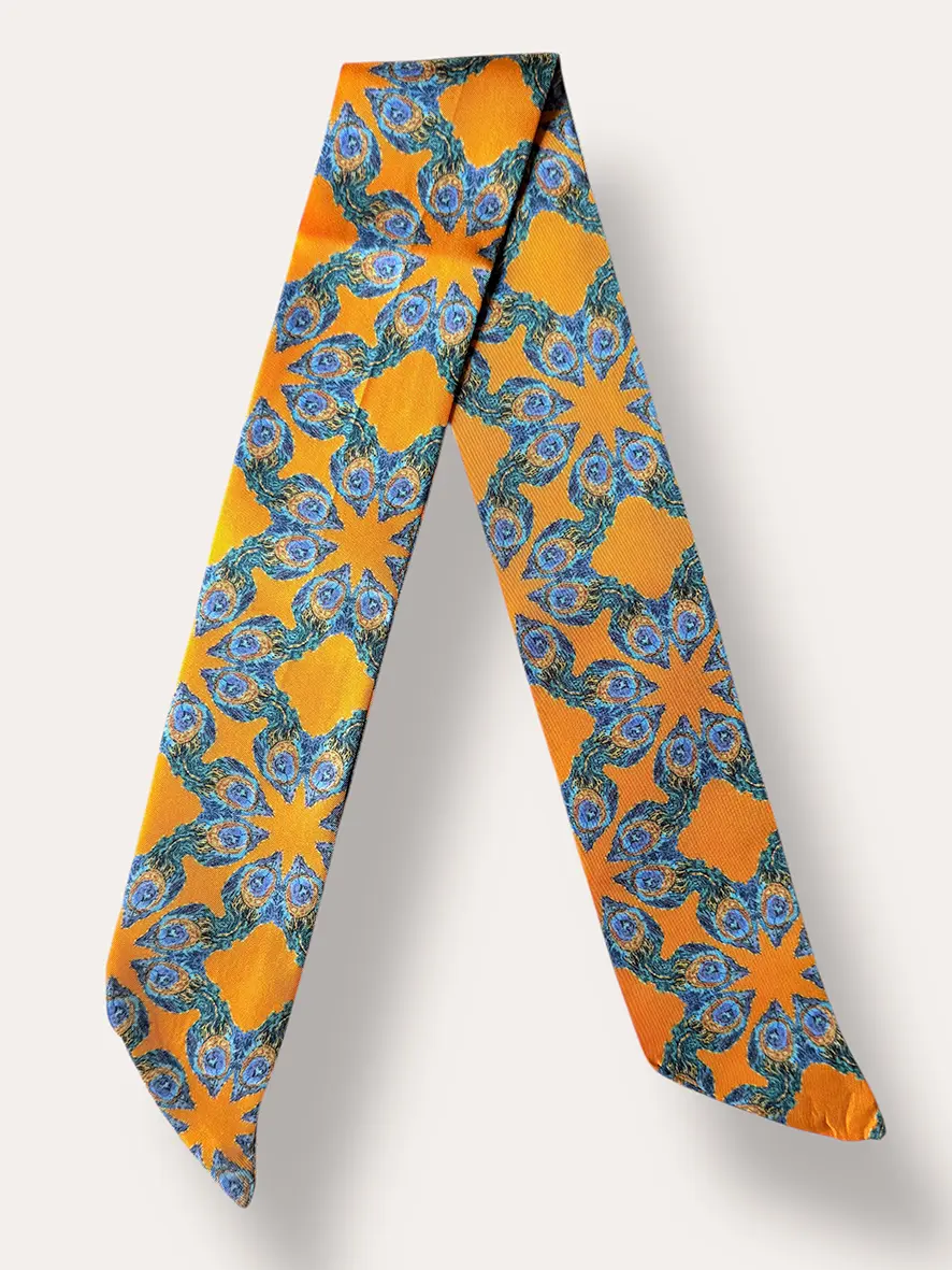 J’avais envie de créer un petit foulard en soie qui soit à la fois léger, joyeux et plein d’énergie. C’est comme ça qu’est né ce mini twilly « Plume de Paon » !