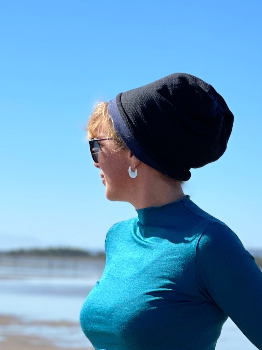 Pas de couture au niveau du col contrairement aux sous-pulls classiques, il a simplement une encolure montante délicatement fini par un point bourdon, comme nos tubandeau, maxitube et chèche.