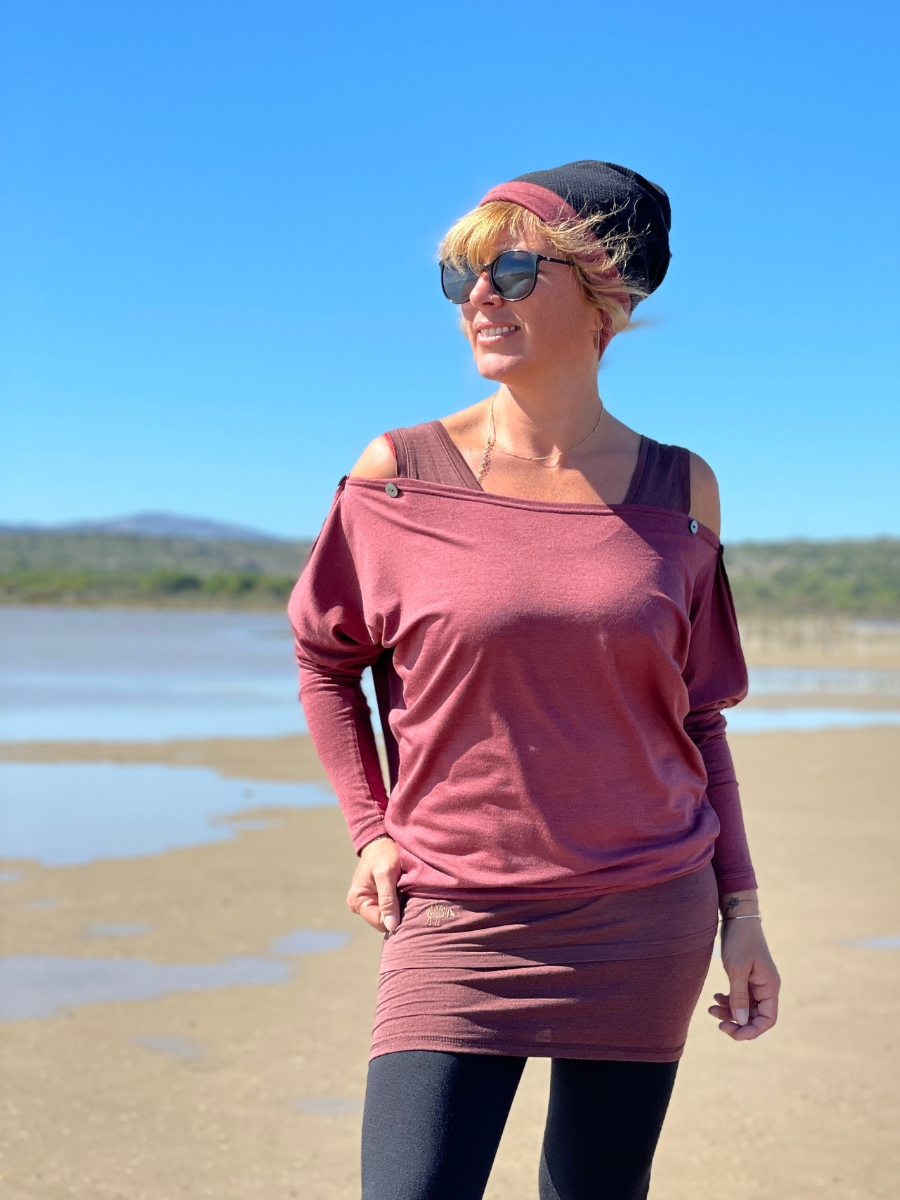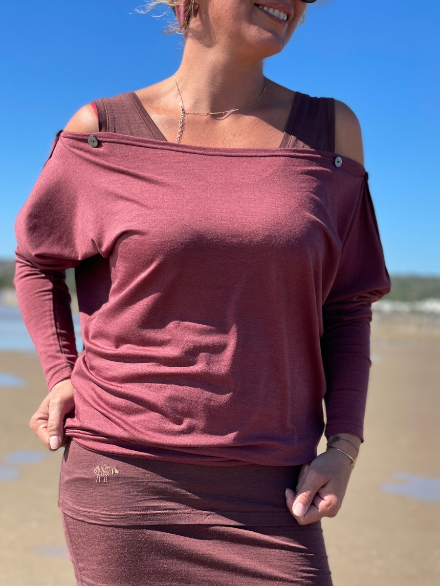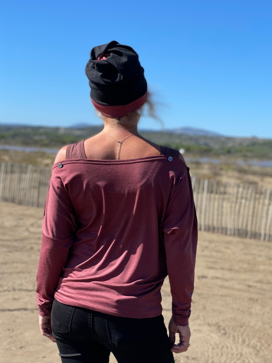 Boutonné sur toutes les épaules, avec le bas à la façon d’un mini TubAtout, il peut se porter de multiples façons.