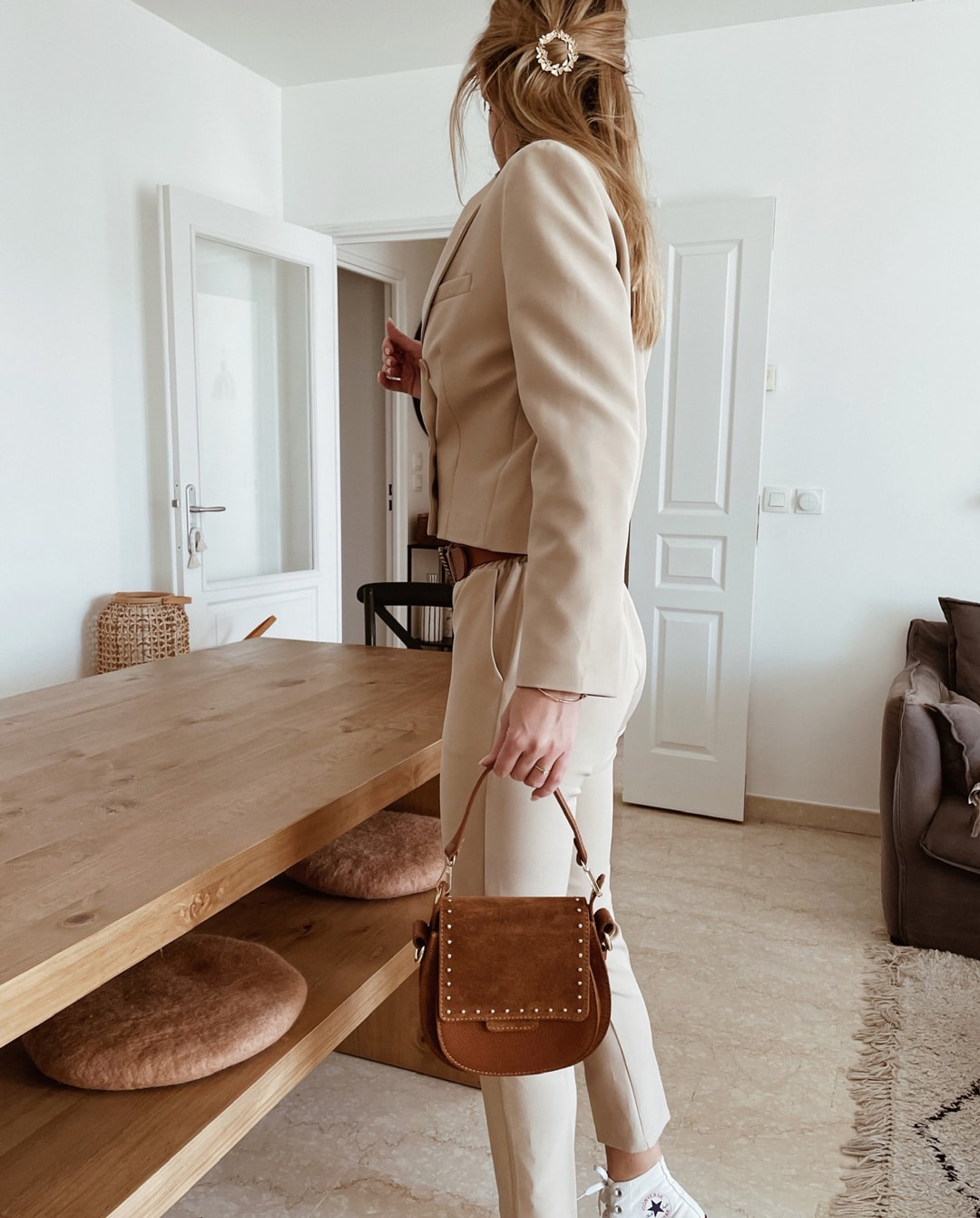 Pantalon beige coupe resserrée en bas.