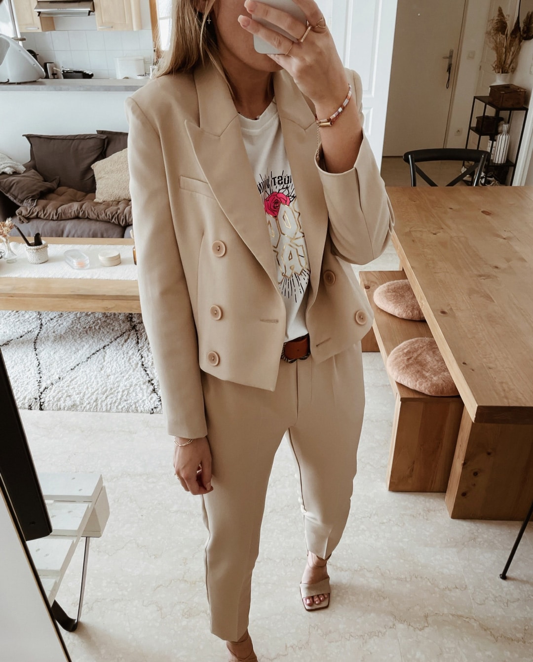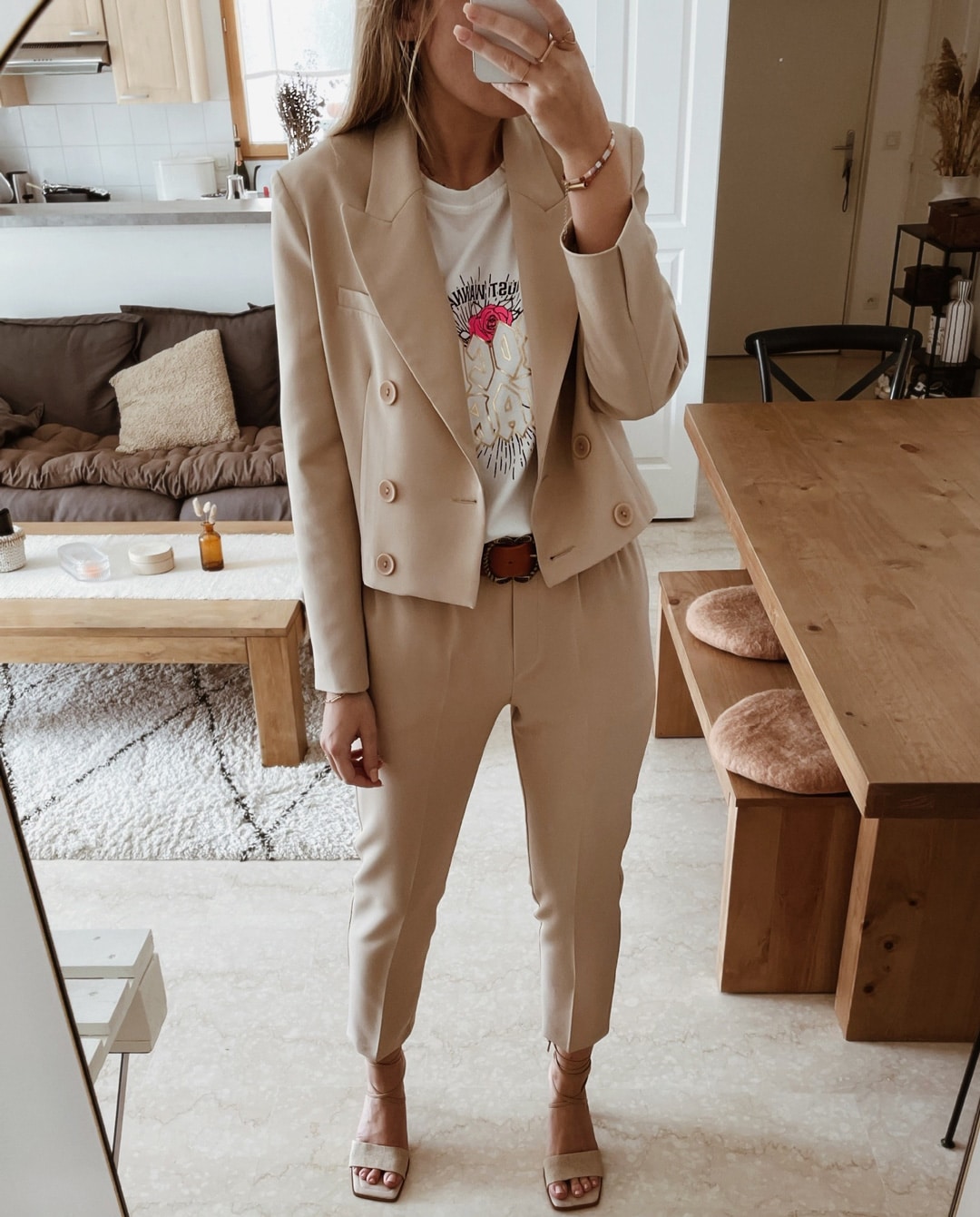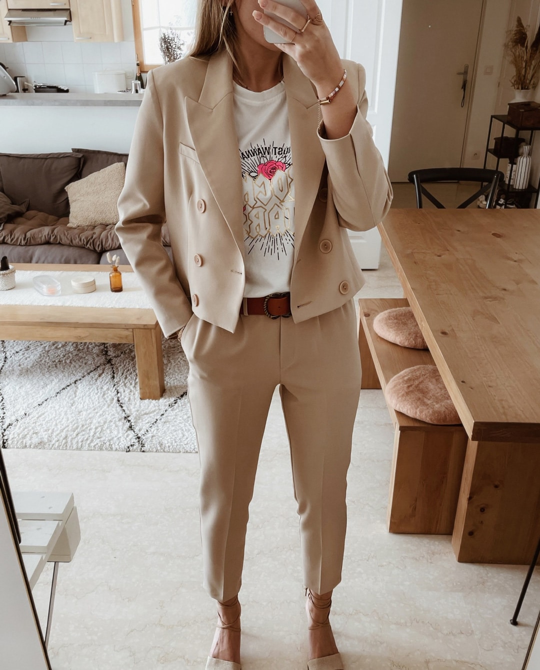 -Le mannequin porte le Pantalon Beige Ricky avec la Veste Blazer Courte Beige Vana assortie, la Ceinture en Coûte de Cuir Sable Isa et le T-Shirt fluo motif tigre rose.