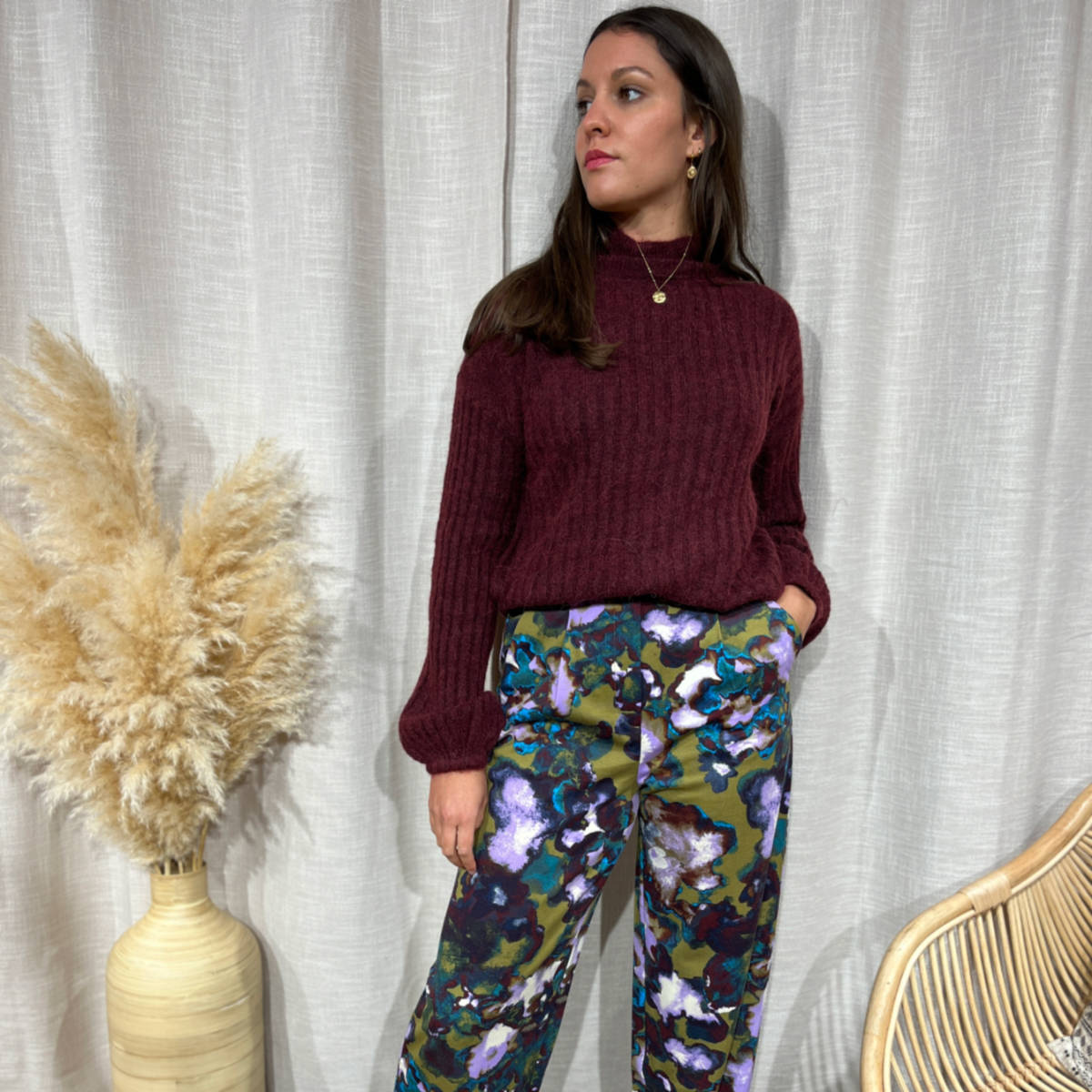 Portez ce pantalon fluide imprimé avec le pull prune : un joli look dans les tons automnaux.