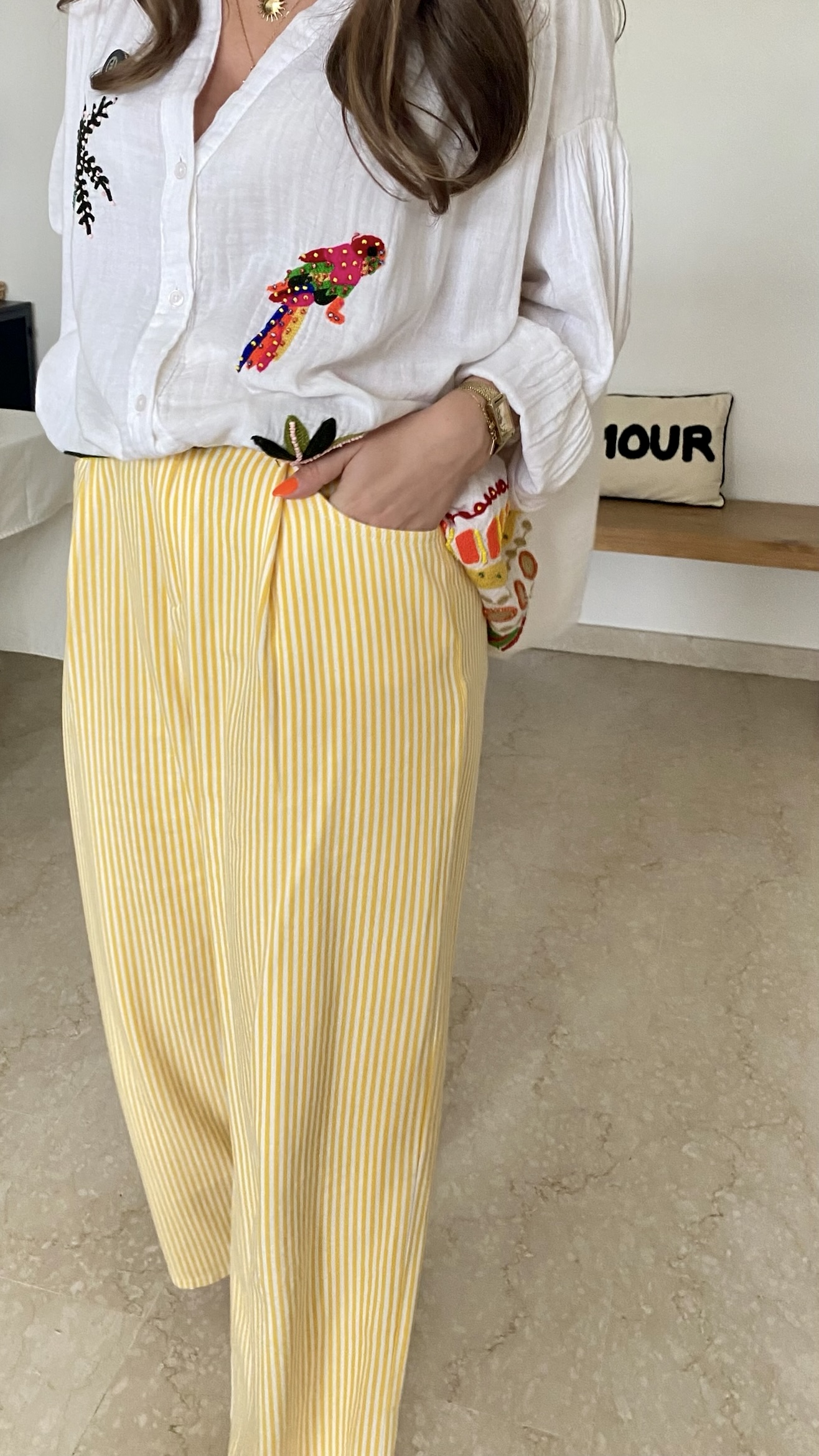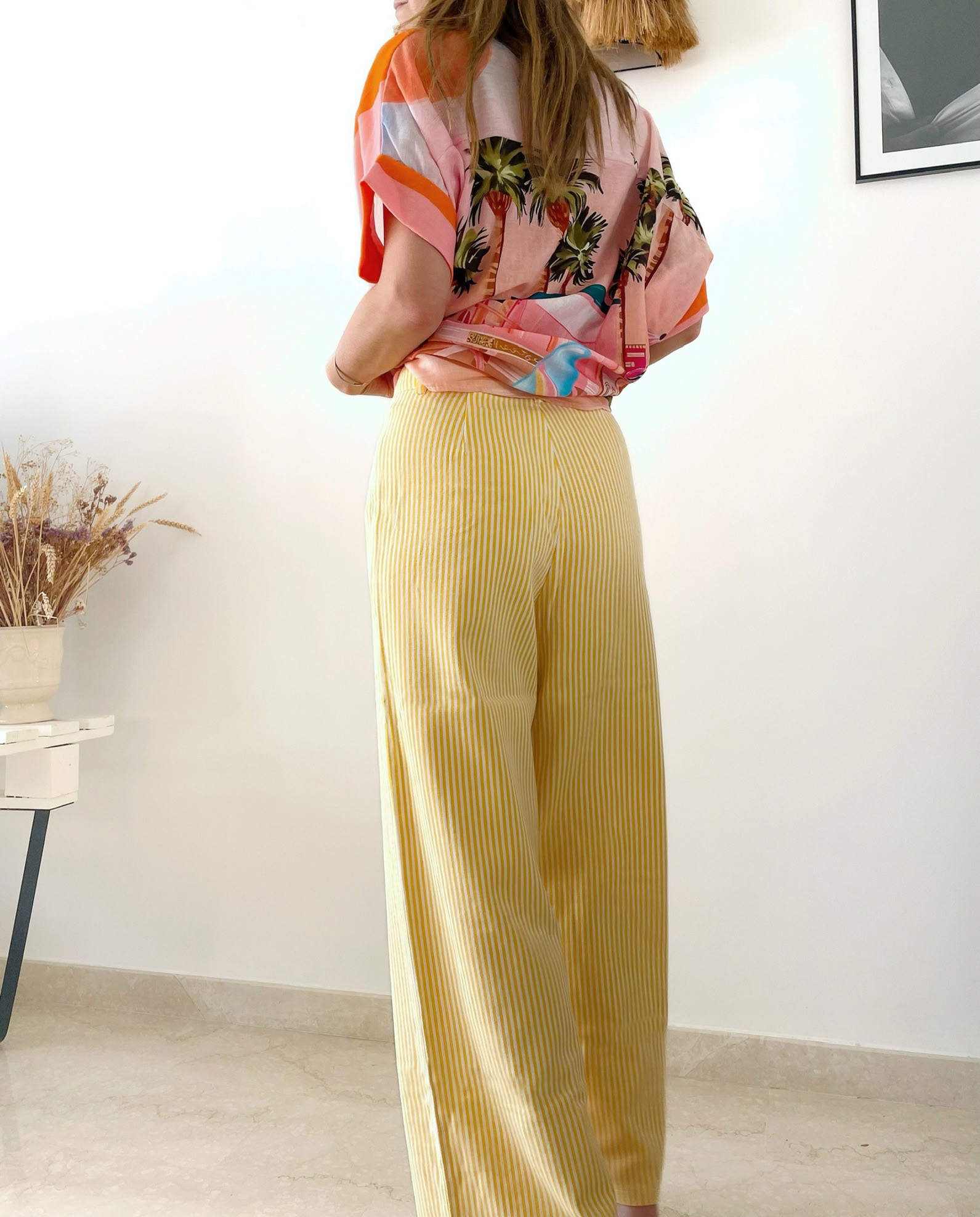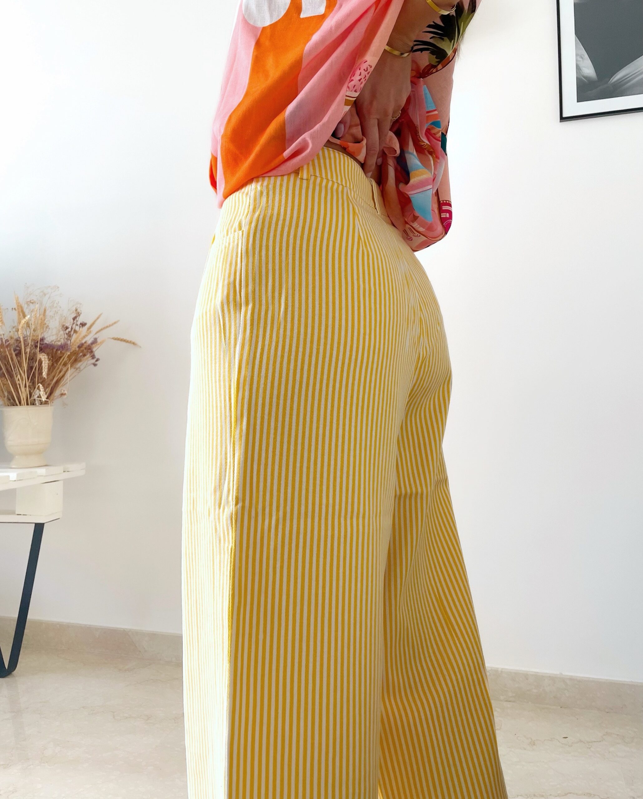 Passants pour la ceinture, bouton et fermeture éclaire, effet de jeux de couture sur le côté de la jambe.