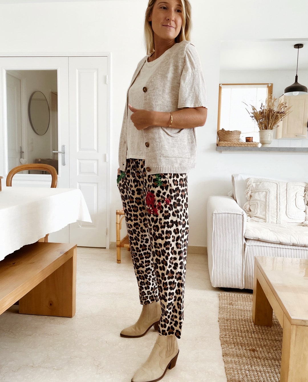 -> Le pantalon léopard bob beinge avec le t-shirt en lin Héna écru et le gilet chiné sable Lorie.