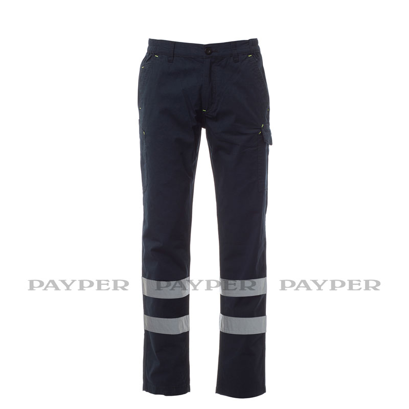 Pantalon en mini Ripstop stretch de coton, léger, avec bandes rétroréfléchissantes de cat. 1, passants et élastique à la taille, fermeture à rabat avec zip et bouton en ceinture.