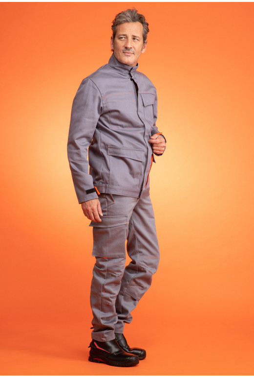 - Fil contrasté orange pour point d’arrêts, surpiqûres pinces genoux et surpiqûres au-dessus des renforts genoux
