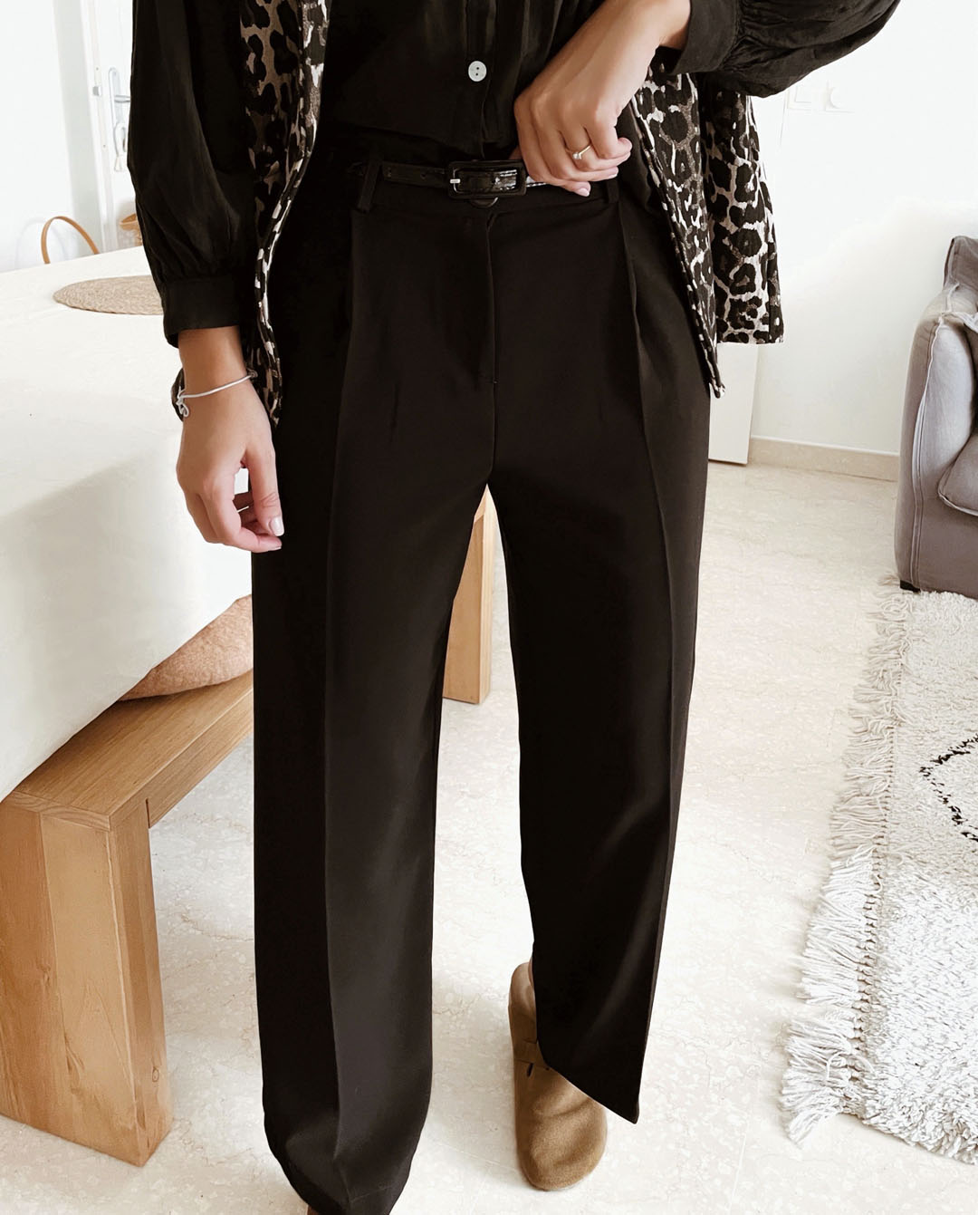-Pantalon taille haute noir évasé à pinces sur le devant.