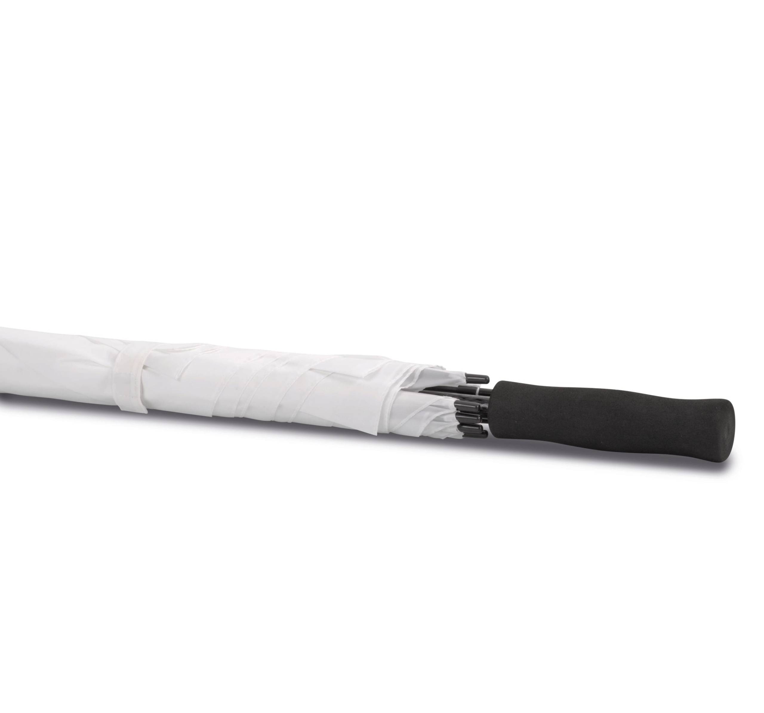 Parapluie de golf carré 30” / (diamètre : 130 cm), ouverture manuelle, baleines et mât en fibres de verre, embout de sécurité, toile en polyester 210T, poignée en éthylène-vinyle acétate (EVA), embouts de baleine et capuchon en polypropylène.