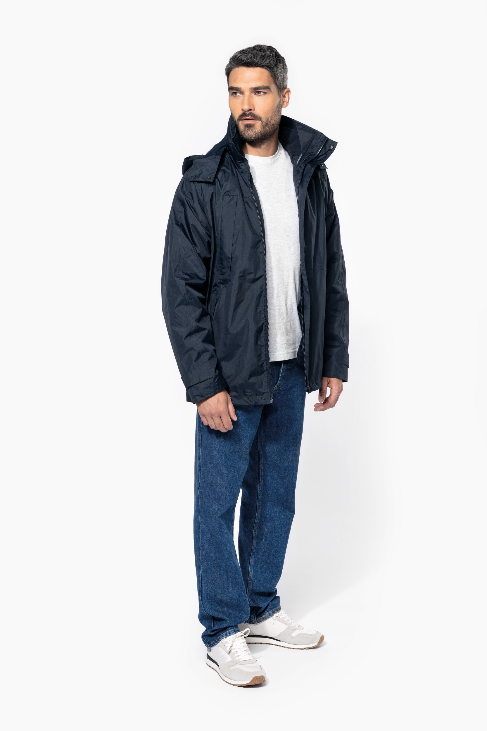 100% polyester enduction PVC. Coutures thermosoudées étanches. Parka 3 en 1 : doublure intérieure bi-matière. Corps : filet 100% polyester. Manches : 100% polyester. Fermeture zippée et patte de boutonnage à pressions. Intérieur col polaire. 3 poches devant zippées avec rabat. Pattes de serrage bas de manches auto-agrippantes. Capuche amovible doublée en filet avec boutonnage à pressions + stoppeurs. Zip intérieur pour personnalisation. Veste polaire : micropolaire 100% polyester. Manches doublées 100% polyester pour faciliter le passage des bras. Fermeture zippée. 2 poches côté. Veste polaire amovible rattachée à la parka par fermeture zip.
