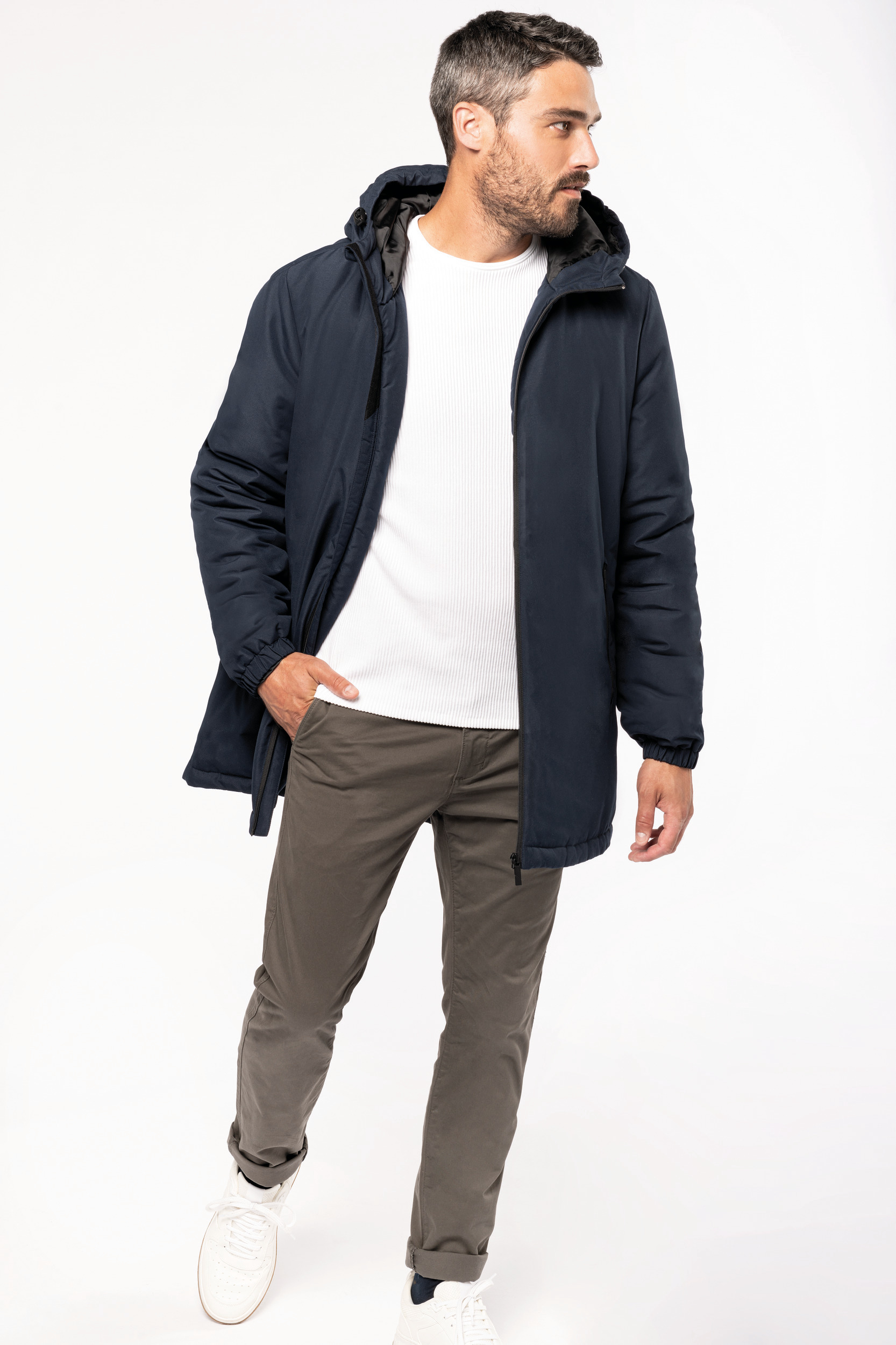 100% polyester recyclé post-consumer. Tissu déperlant. Finition peau de pêche pour un toucher plus doux. Doublure polyester taffeta 210T noire. Intérieur matelassé 100% polyester. Coupe confort. Fermeture zippée nylon et tire-zip métal. Capuche 3 panneaux doublée polyester avec cordon de serrage et stoppeurs. 2 poches devant zippées. 1 poche intérieure avec fermeture par bande auto-agrippante. Bas de manches élastiqué. Dos rallongé pour plus de confort. Patch tissu intérieur col pour la personnalisation. Zip invisible côté cœur et bas de vêtement pour accès personnalisation. Pas d’étiquette de marque pour faciliter la personnalisation.