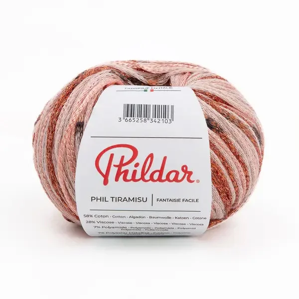 La pelote de Phil Tiramisu de chez Phildar ets une belle fantaisie d’été. Un effet multicolore , une touche de lurex, de jolis coloris qui travaillent sous l’effet de vos aiguilles pour un joli pull ou top d’été.Composée en majorité de coton, ce fil est confortable et souple.La rondeur du fil en fait une maille très facile à tricoter.