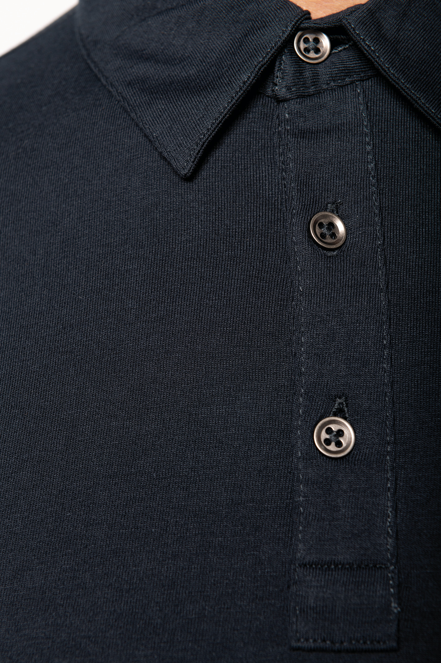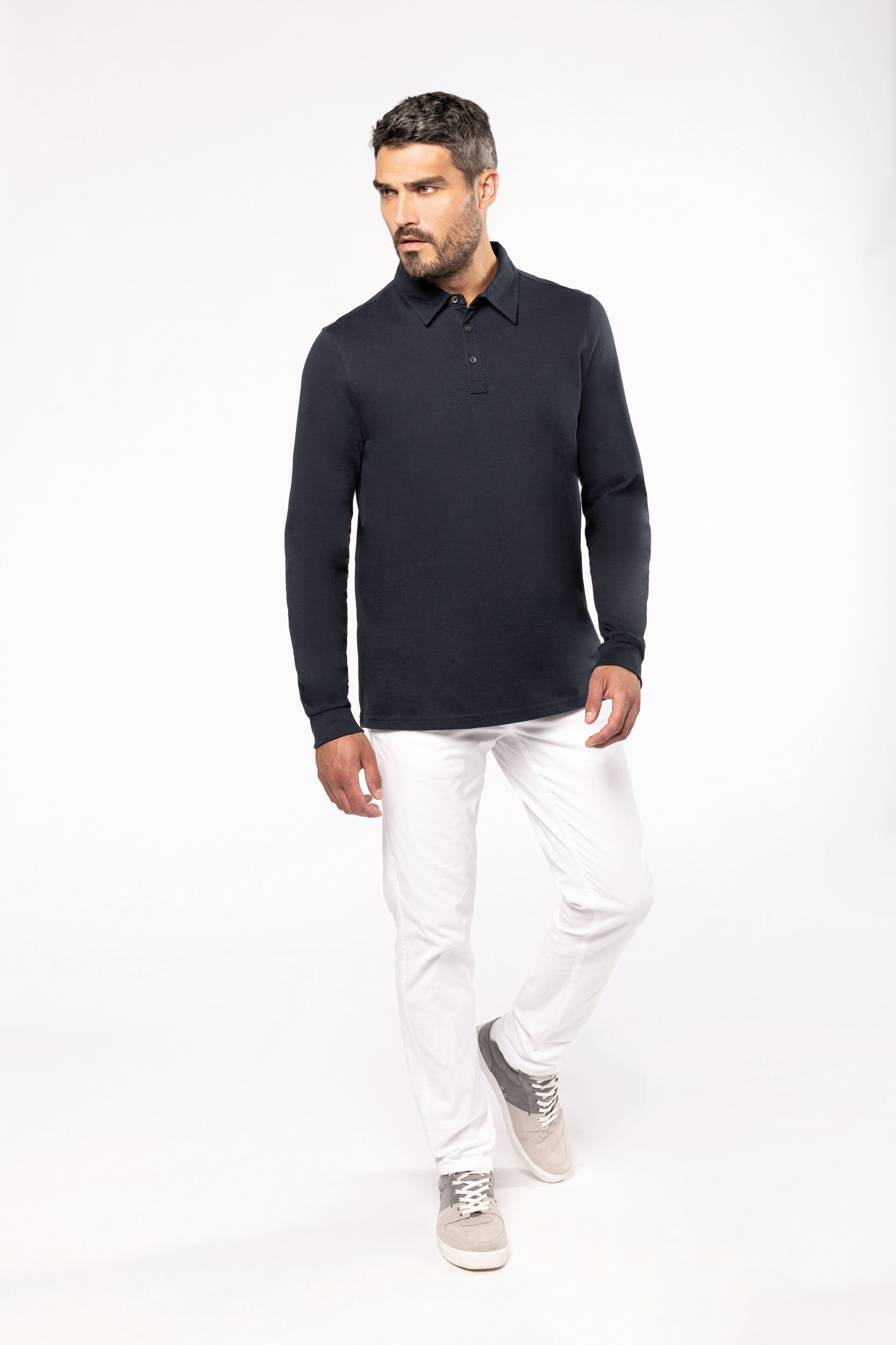 100% coton (Grey Heather : 65% polyester / 35% coton – Oxford Grey : 90% coton / 10% viscose). Maille jersey en coton peigné. Col chemise. Patte de boutonnage col 3 boutons métal. Empiècement épaule. Poignet en bord-côte. Double aiguille bas de vêtement.