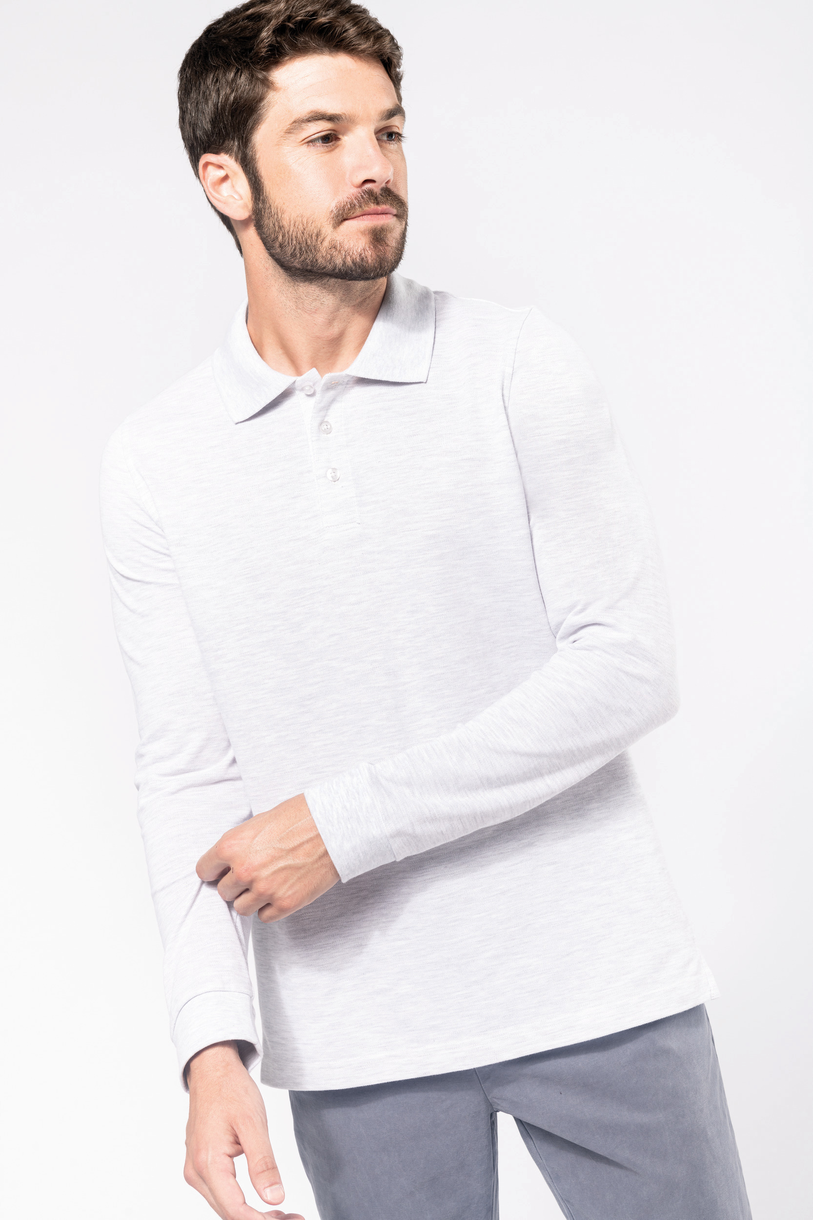 Coloris unis : 100% coton – lavable à 60°C. Coloris Oxford Grey : 90% coton / 10% viscose – lavable à 40°C. Coton peigné maille piquée. Col en bord-côte. Bande de propreté encolure et fentes côté contrastée Dark Grey pour le polo Oxford Grey et Oxford Grey pour tous les autres coloris. Finition double aiguille bas de vêtement. Patte de boutonnage 3 boutons. Poignets en bord-côte.