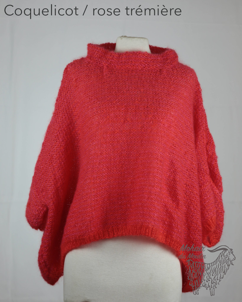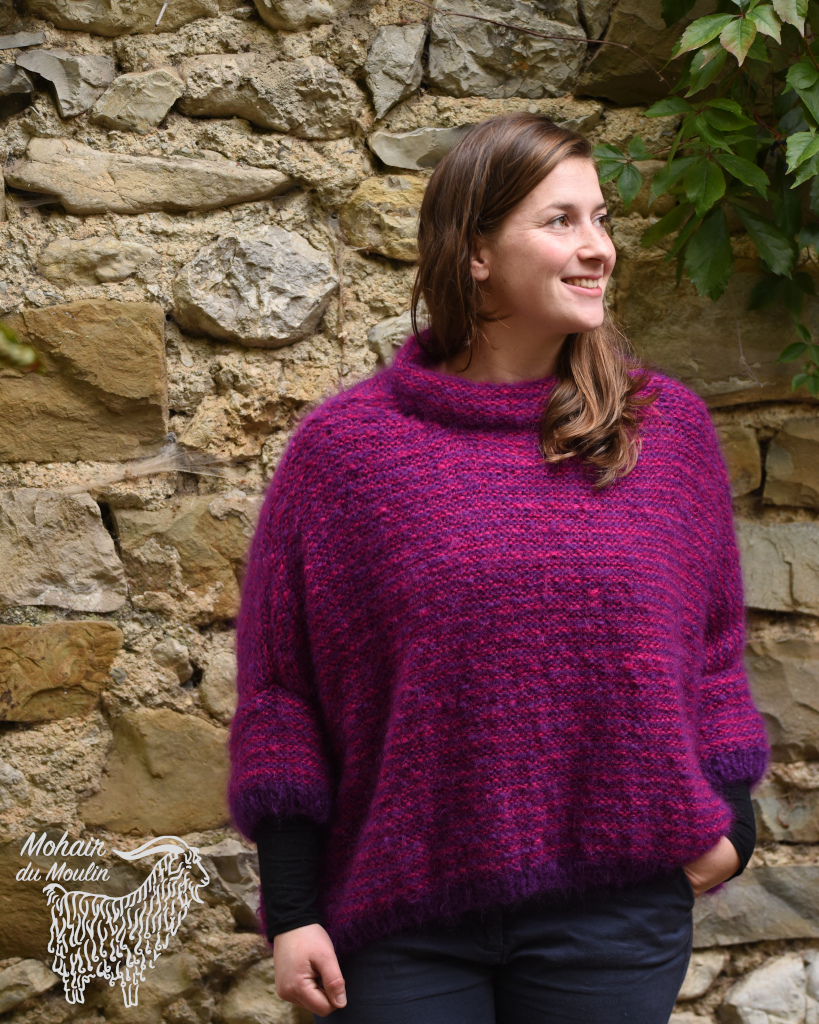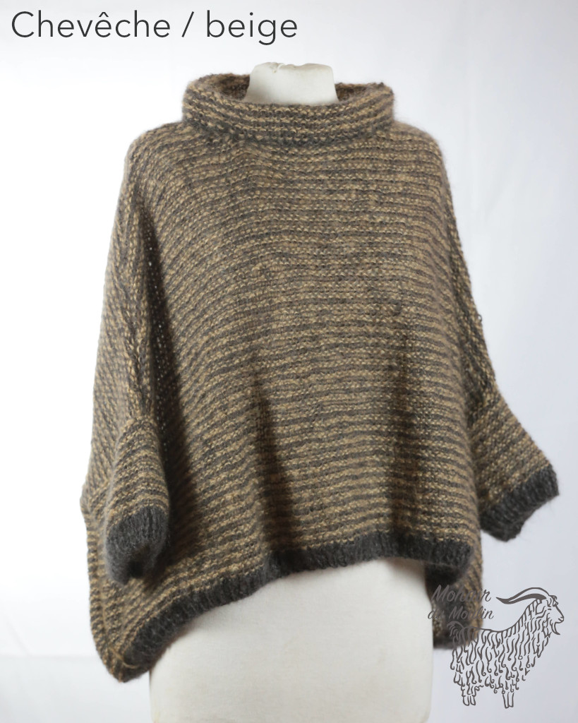 Le poncho mohair Zébra est tricoté avec le fil « Symphonie », le plus gros fil de notre gamme. C’est une taille unique.