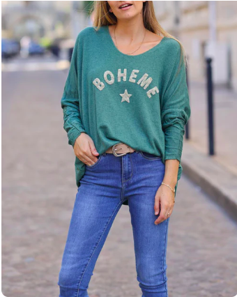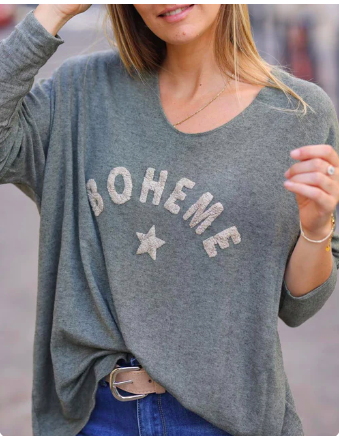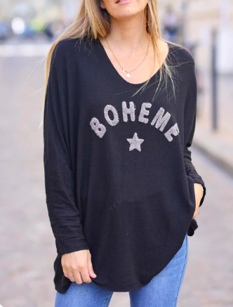 Pull  col V, avec une inscription « Bohème »  sur le devant.
