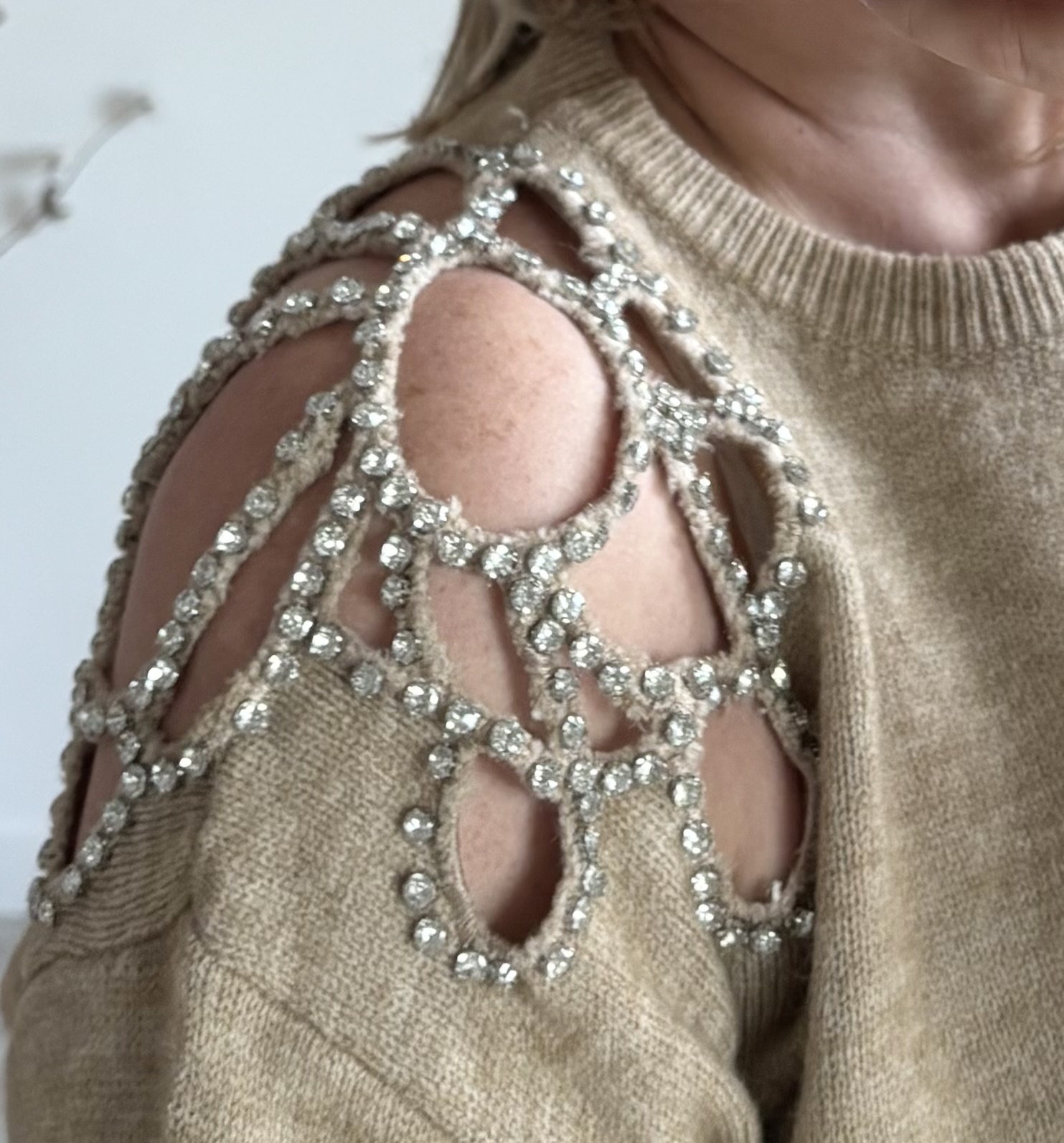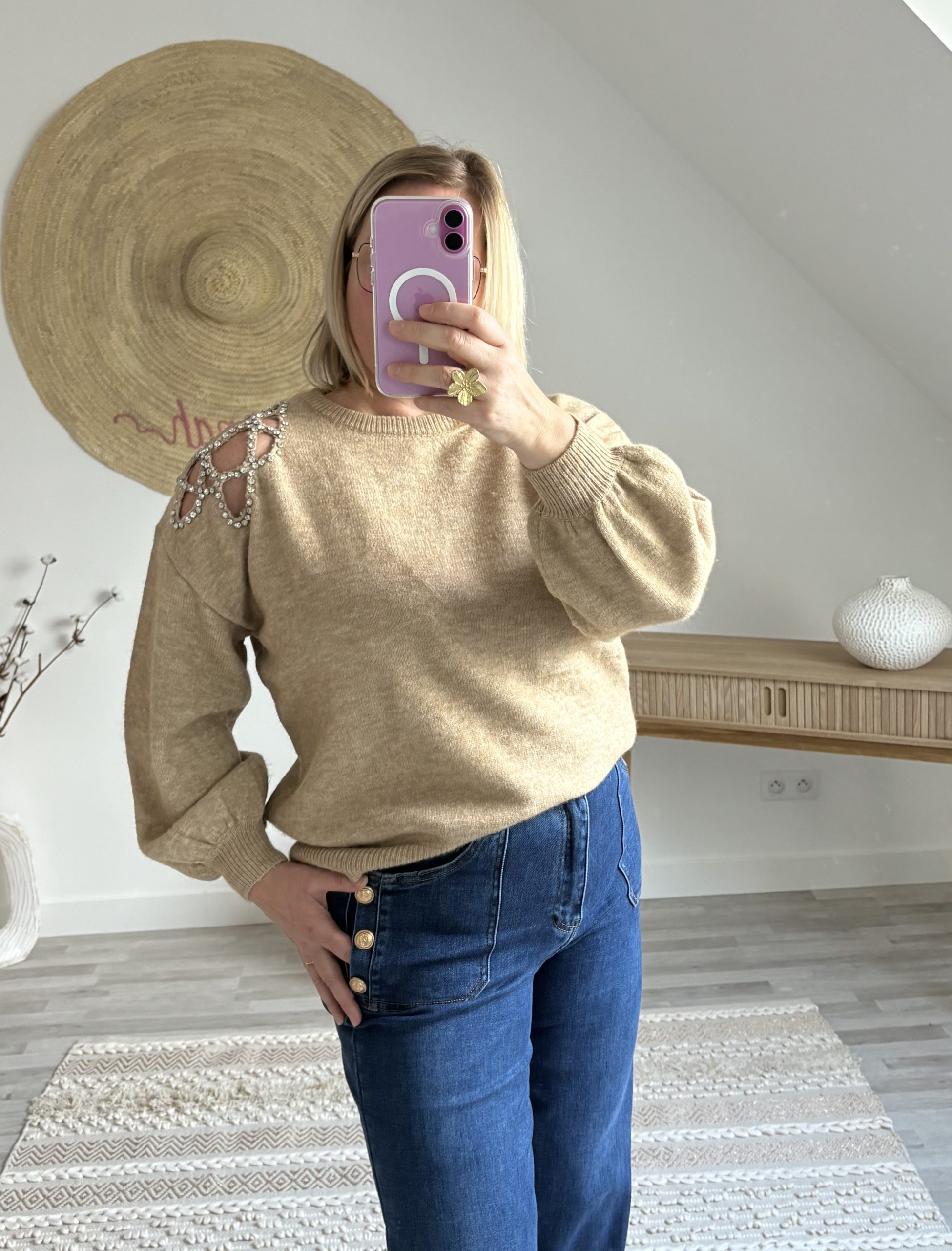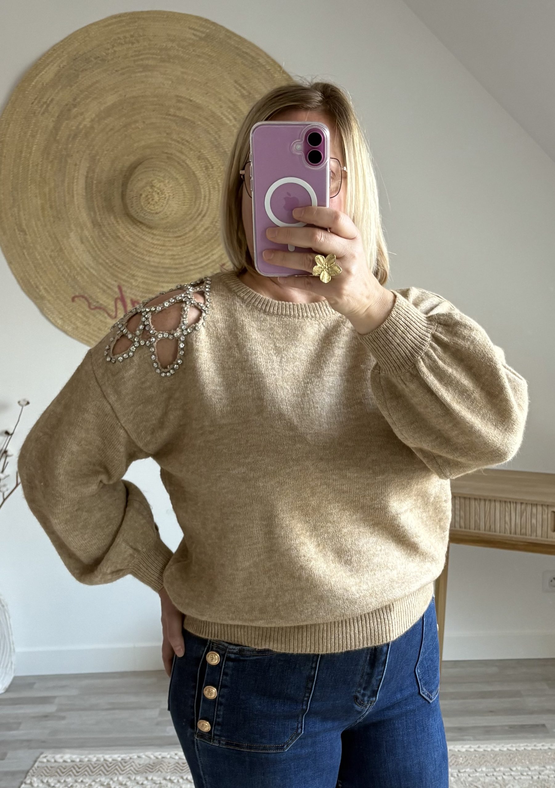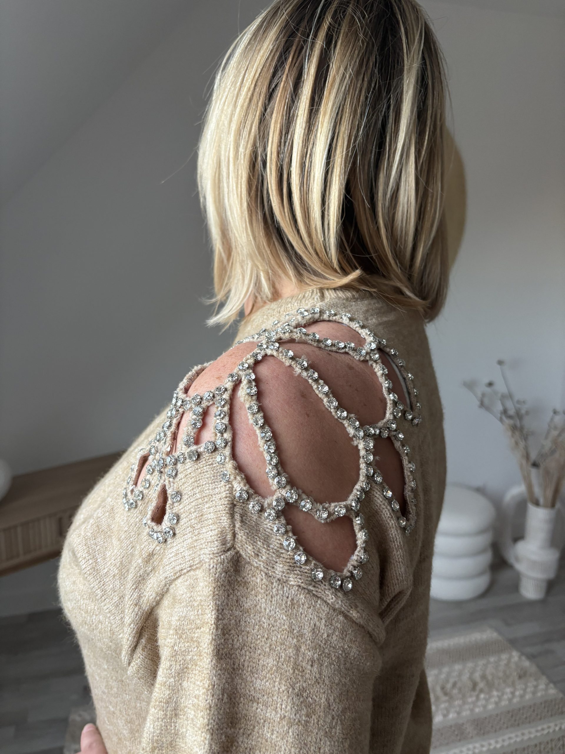 Découvrez le pull oversize femme Scarlett de Milanah. Avec ses détails en strass et sa coupe ample, il conjugue confort et élégance. Disponible en camel ou kaki à 39 €.