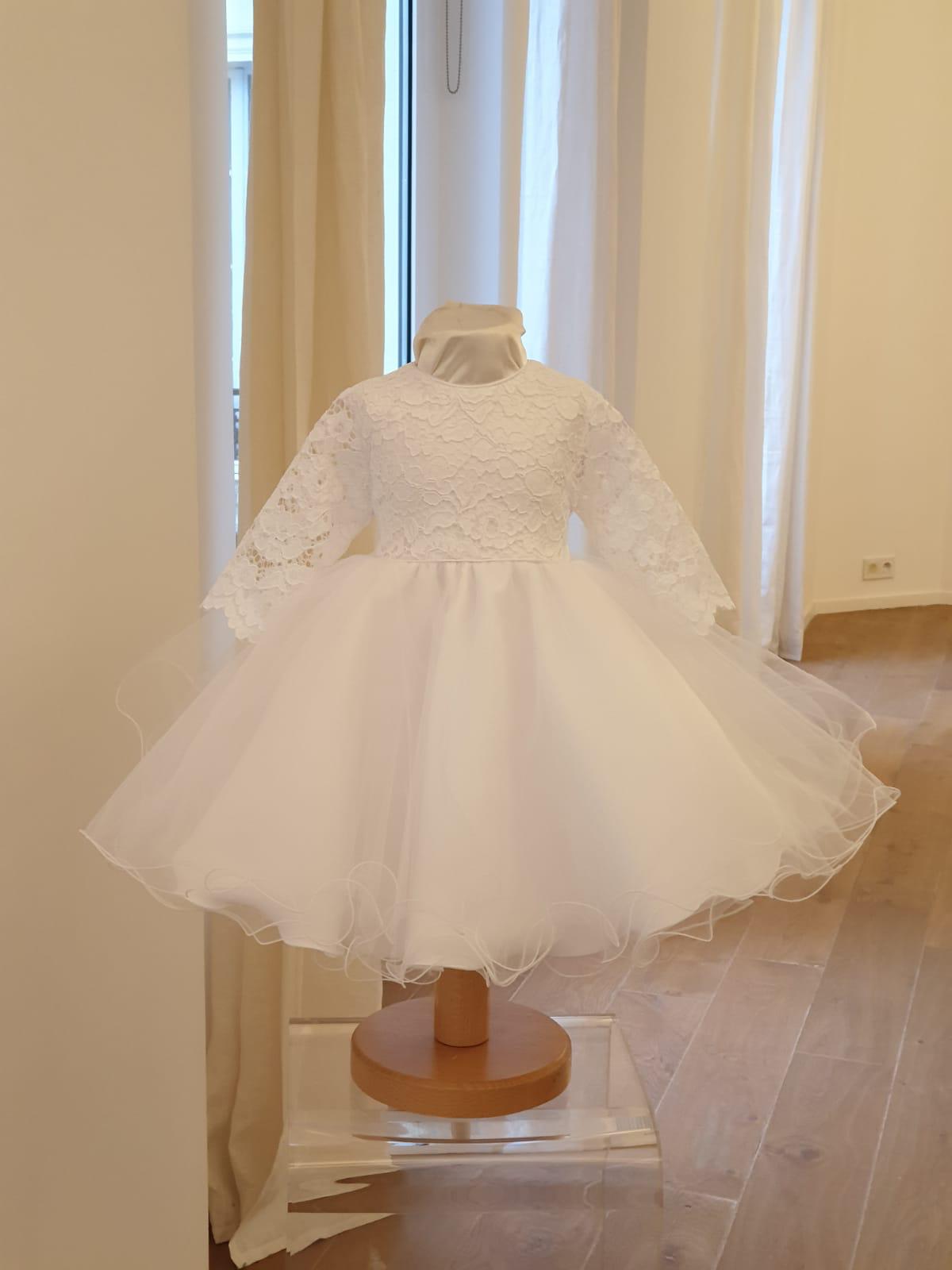 Robe Chloé blanche 135 euro robe de bapteme en tulle blanc doublée coton le haut est en dentelle avec manche transparente cette robe est fabriquée en France dans notre atelier parisien