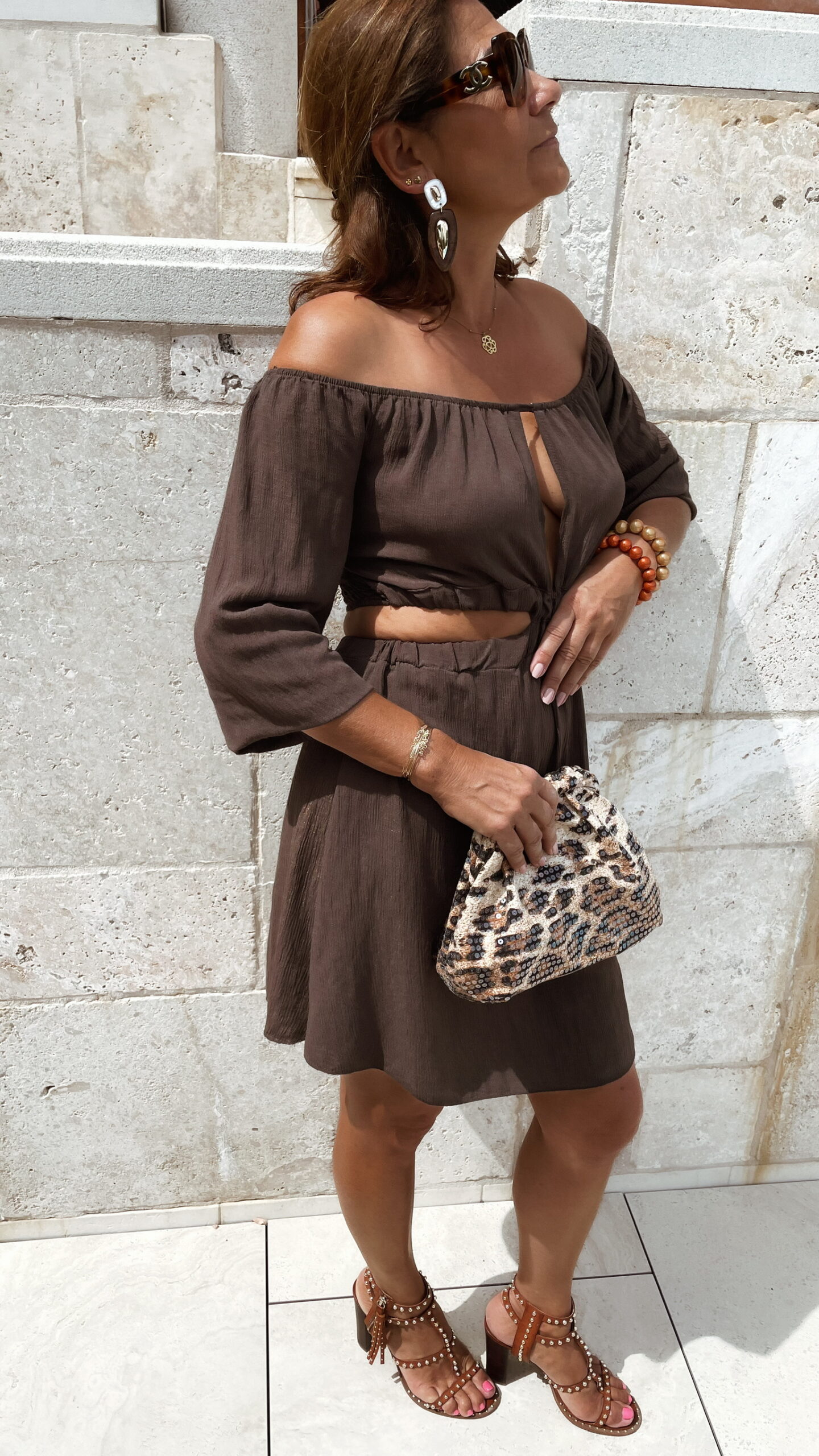-La robe Stella est portée avec le sac Boum Leopard à sequins, les bracelets Terracotta Camel et les Boucles d’Oreilles Blanc Doré Marron (Clips).