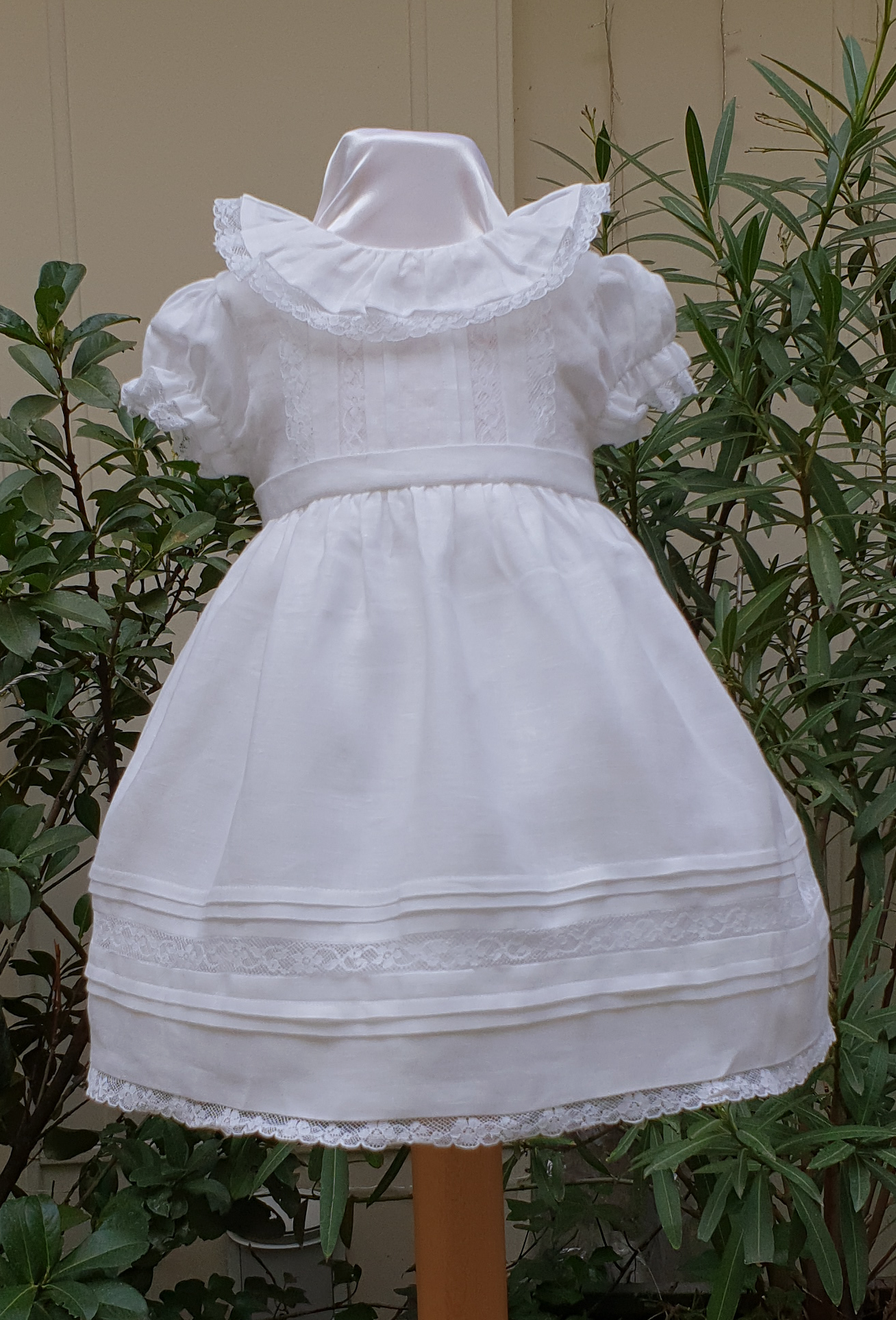 Cette robe de bapteme en lin avec des incrustations de dentelle.