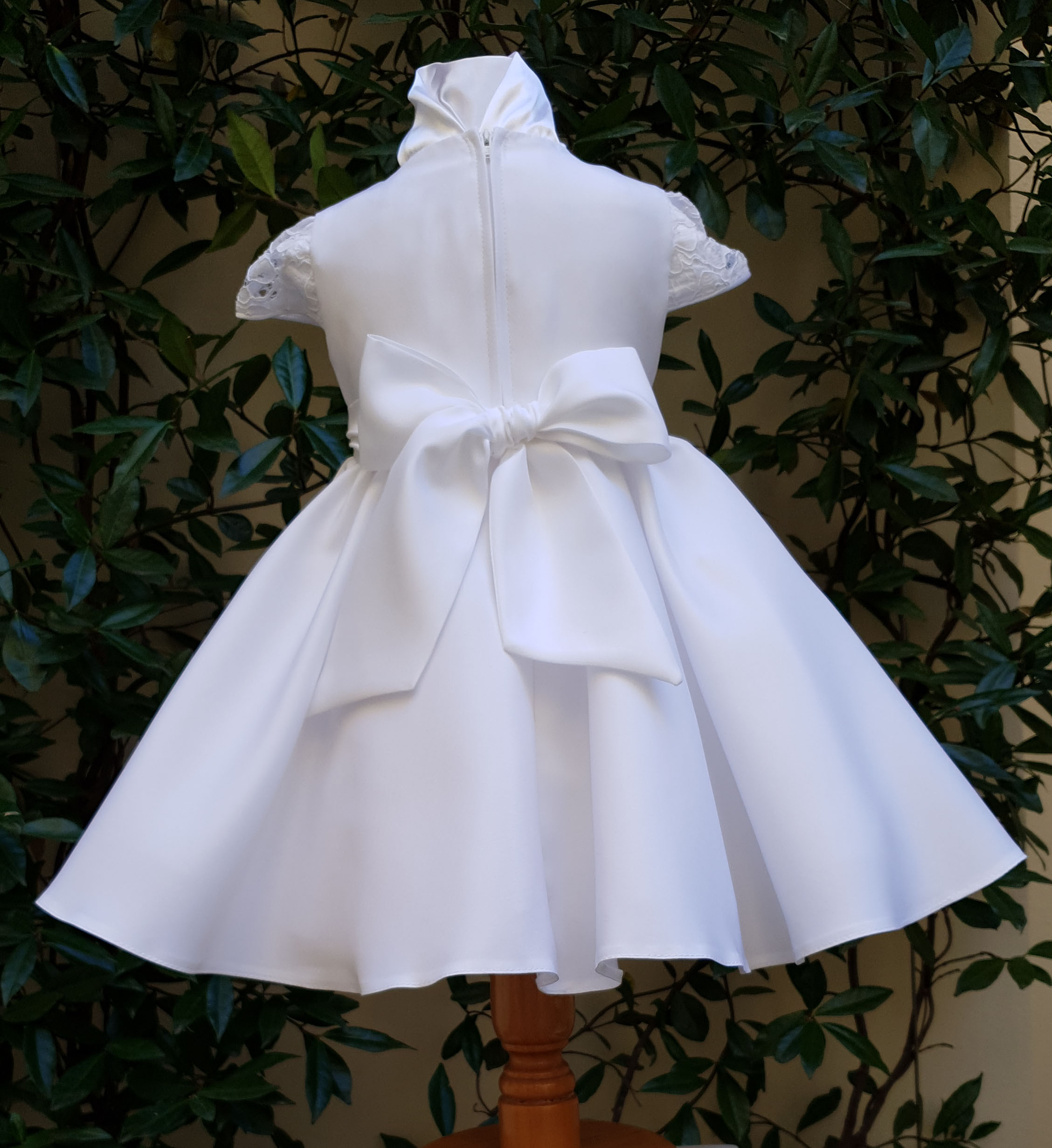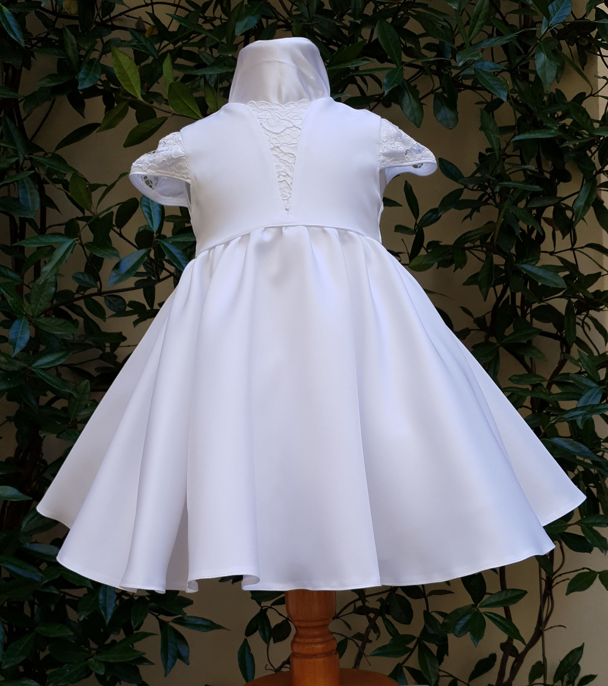 Cette robe de baptême est en ottoman blanc avec incrustation de dentelle aux manches et devant sur le buste.