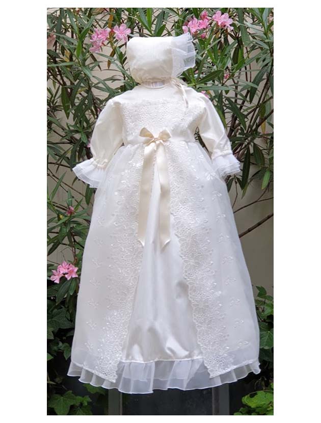 Robe de bapteme longue en satin écru recouverte d’organza brodé blanc cassé.