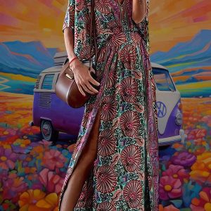 Cette robe ? C’est le manifeste textile d’un monde en paix, la proclamation d’un été sans chaussures, le plaidoyer d’un cœur tambour. D’un vert végétal gorgé d’émeraudes diluées, elle s’ouvre comme une clairière de satin, épanouie, dansante, impétueuse. La coupe est ample, fluide, presque insolente de confort : on y entre comme dans un hamac céleste. Et au bas de ce miracle virevoltent les jardins luxuriants d’un trip psychédélique, où des fleurs gigantesques, enchevêtrées et bariolées, composent une valse botaniques à vous faire flancher les chakras.
